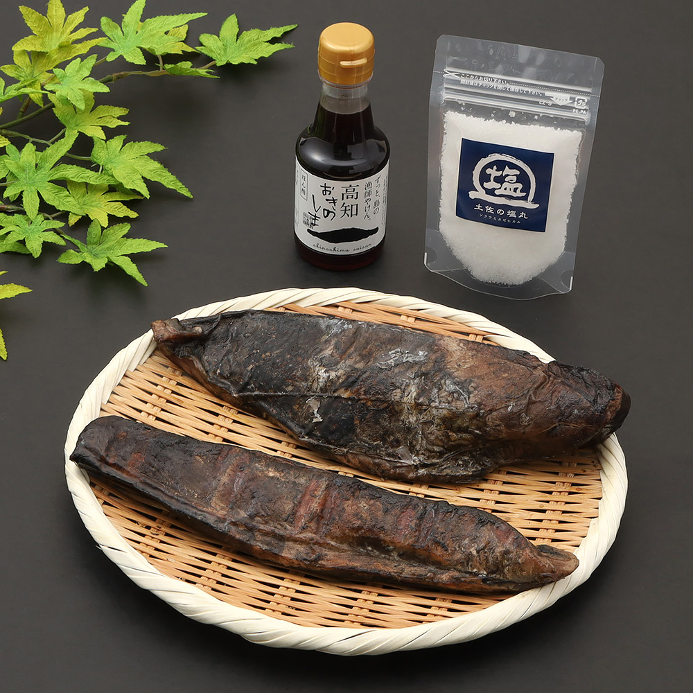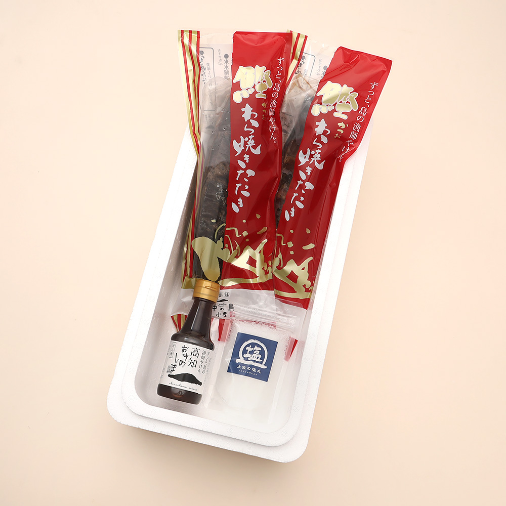 鰹わら焼きたたき300g×2本、特製ぽん酢醤油150ml、土佐の塩丸(天日塩)90g