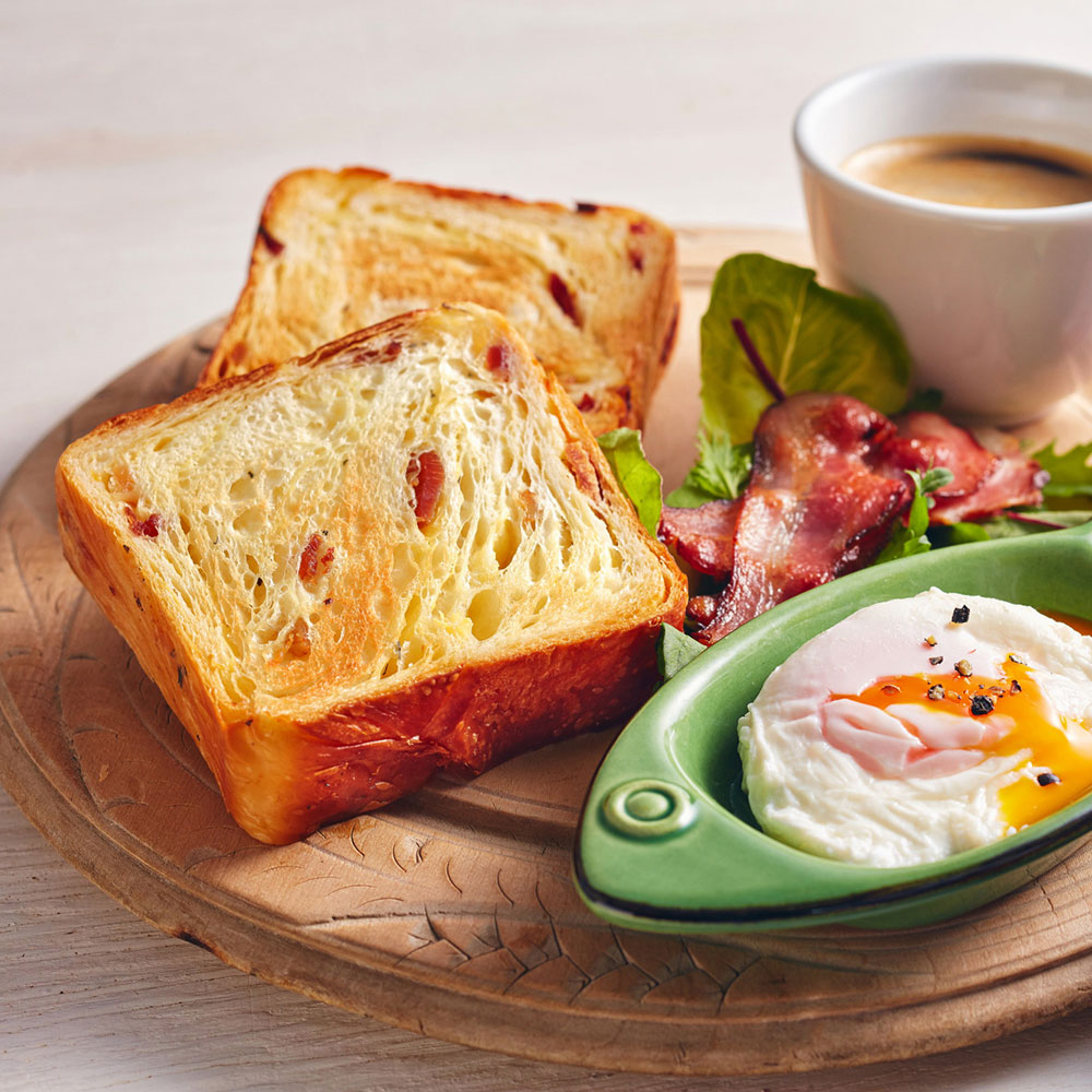 人気商品の「あんバター」は、芳醇なバターの香りと北海道産小豆の甘さ控えめな小倉あん、かのこを織り込みました。後を引く塩味も軽やか。「チーズ&ベーコン」はコクのあるチーズとベーコンを織り込みました。食事やワインのお供にも、ティータイムや食事にもぴったりな2本セットです。