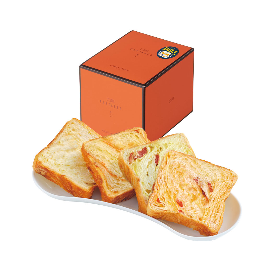 パルタージェ セレクト1箱(ベリーベリー・あんバター・祇園辻利抹茶ショコラ・モカショコラ 各1枚)、パルタージェ DELI1箱(プレステージ・チーズ&ベーコン・めんたいこ・ピザ 各1枚)