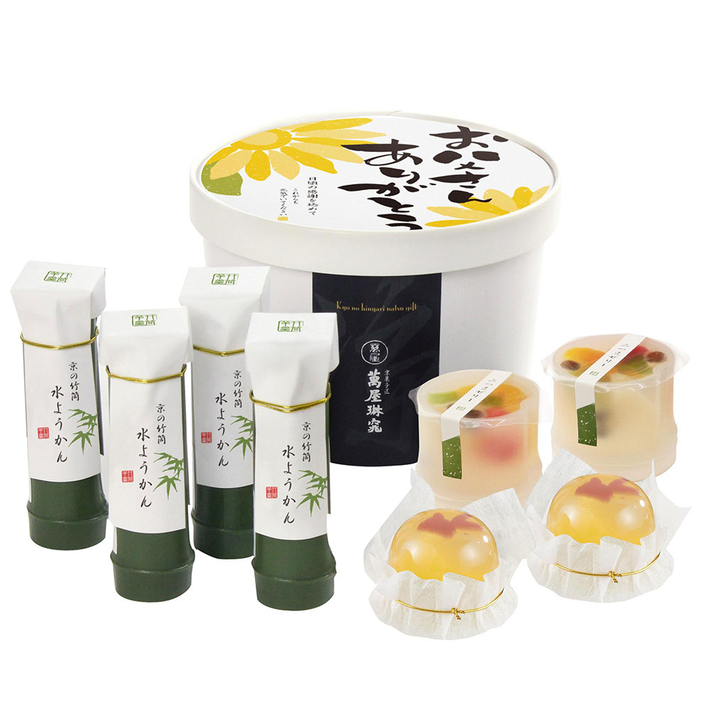 涼しげな金魚が泳ぐゼリー、カラフルなみつ豆ゼリー、口どけなめらかな竹筒入り水ようかんを詰め合わせました。父の日のメッセージをつけてお届けいたします。※竹筒はプラスチック製です。