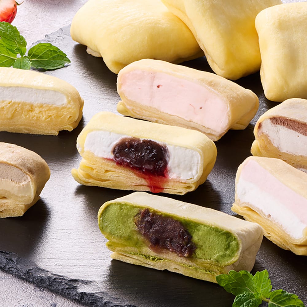 【冷凍便でお届けします。解凍まで時間がかかりますのでご注意ください。】生地は和菓子屋ならではの大福のようなもちっとした食感を再現しております。その風味豊かなクレープ生地に、甘さ控えめのホイップクリームを包みました。7種類のクレープとバラエティ感のあるセット。