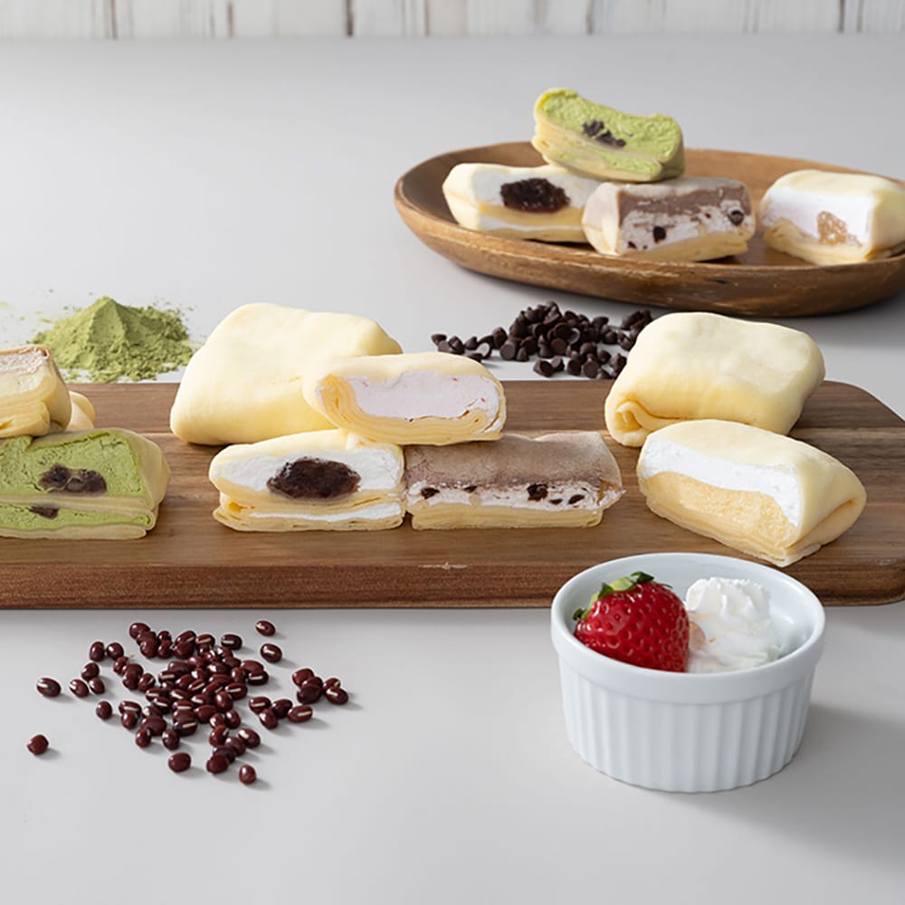 カスタード&ホイップ・抹茶ホイップ&粒あん・ストロベリー&粒あん×各2個、チョコホイップ&チョコチップ・ストロベリー&ホイップ・ティラミス・白いちごクレープ×各1個