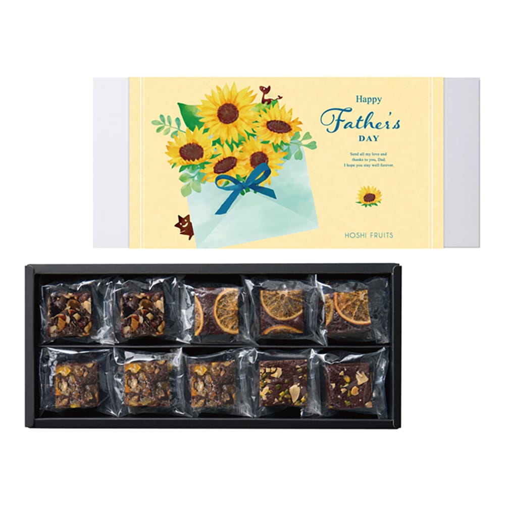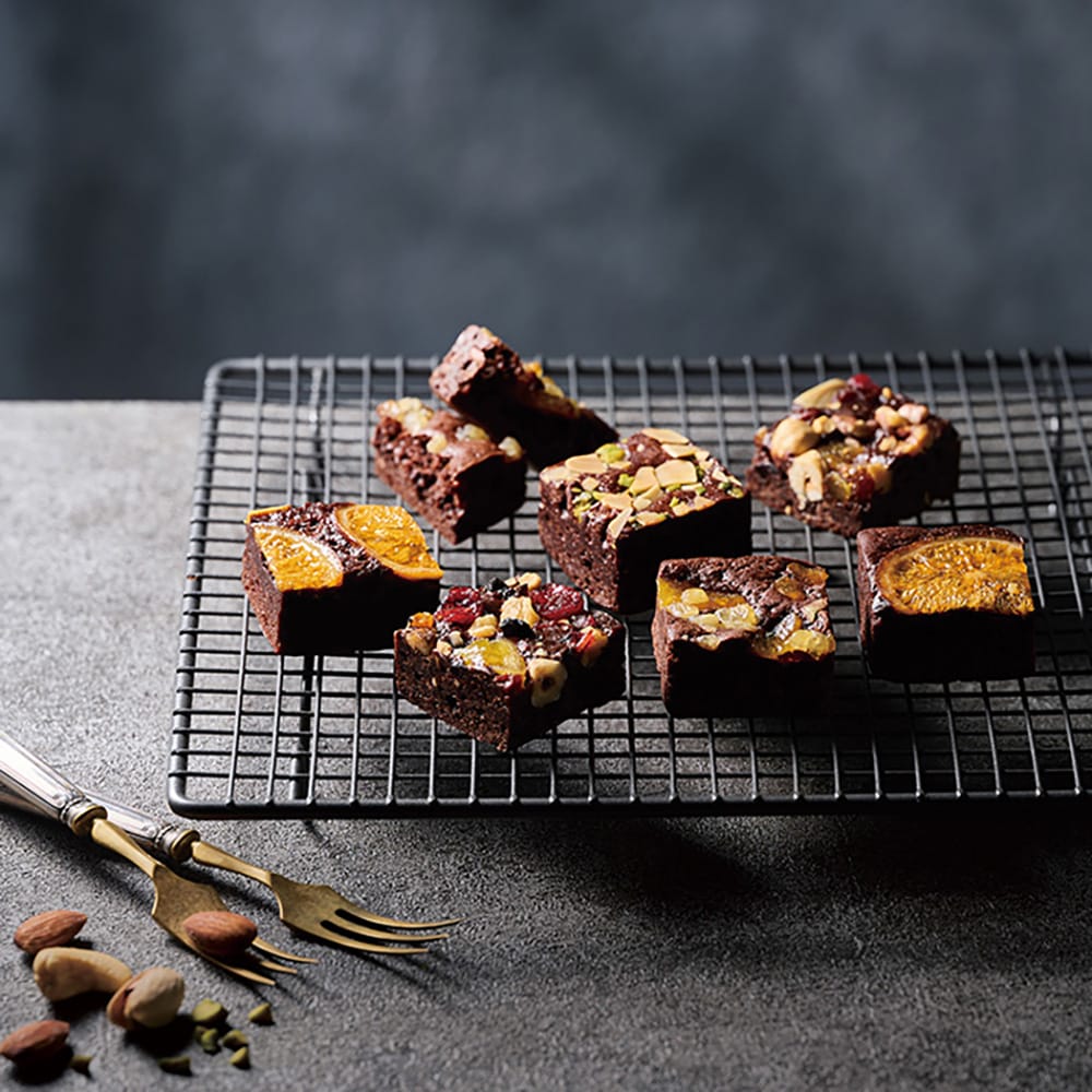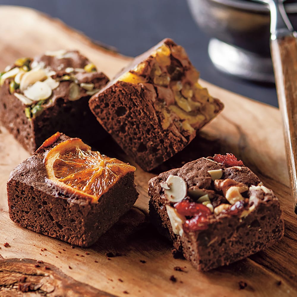 濃厚なチョコレートの生地に、香ばしいナッツや甘酸っぱいフルーツをトッピング。ピスタチオとアーモンド、ごろっとしたパイナップルやネーブル、たっぷりのドライフルーツとナッツ。おいしさをぎゅっと詰め込んだキューブが、お口に小さなしあわせをお届けします。