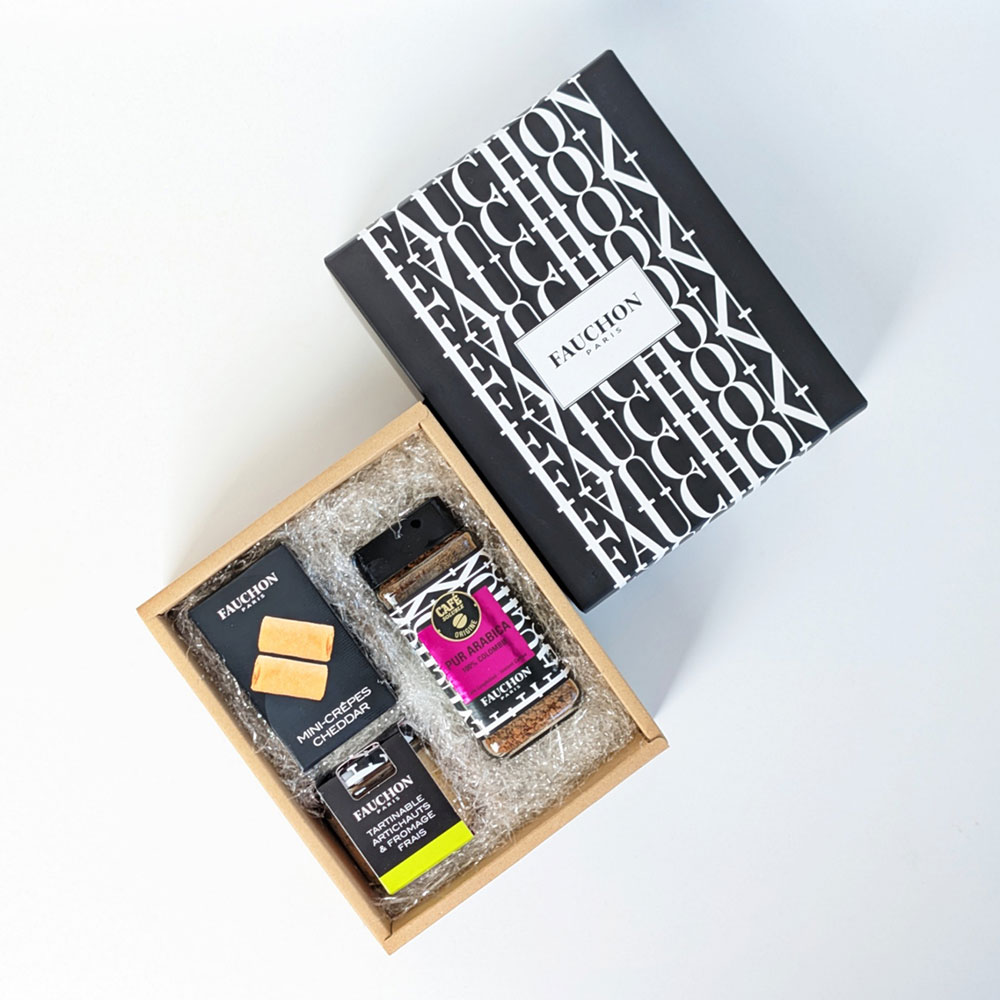 フランスの美食ブランド<フォション>のベジタブルスプレッド・インスタントコーヒーとミニサイズのスナックの詰合せ。
