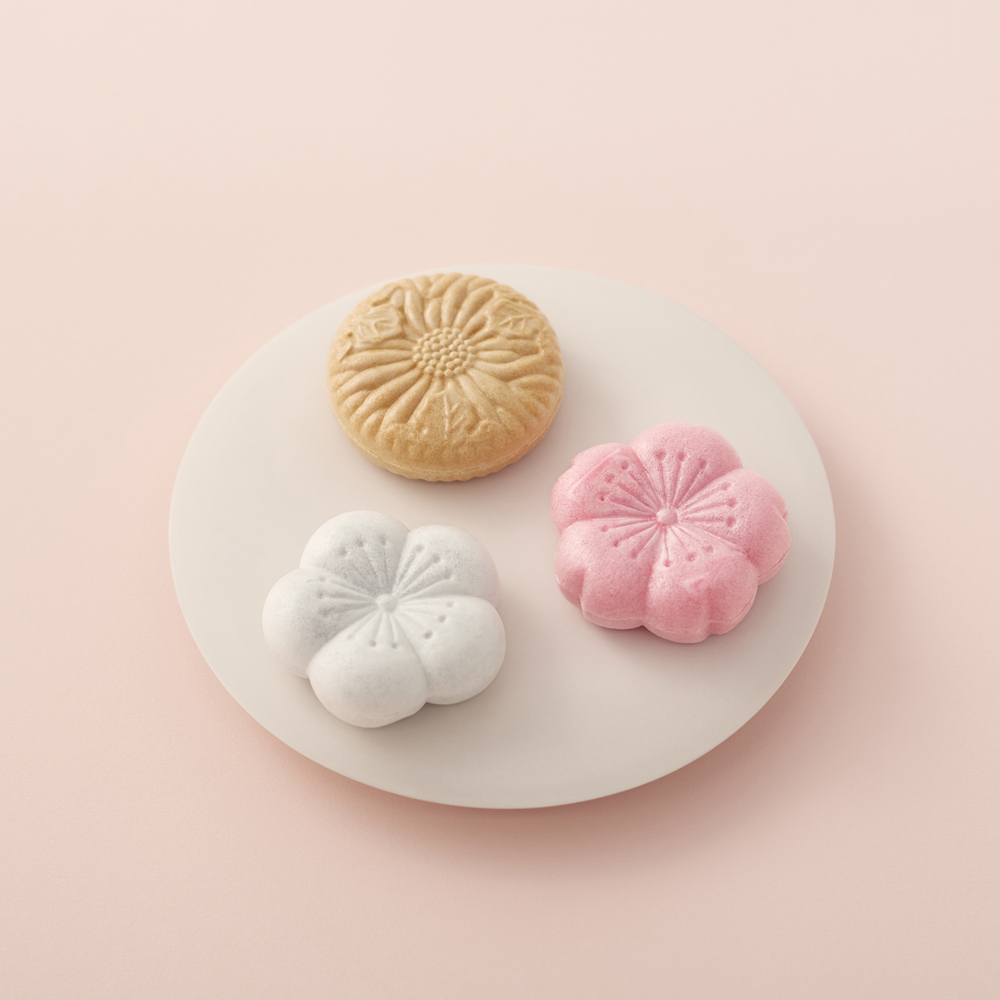 最中『弥栄』『御代の春 紅』『御代の春 白』各2点と、生姜入焼菓子『残月』5点を詰め合わせました。
