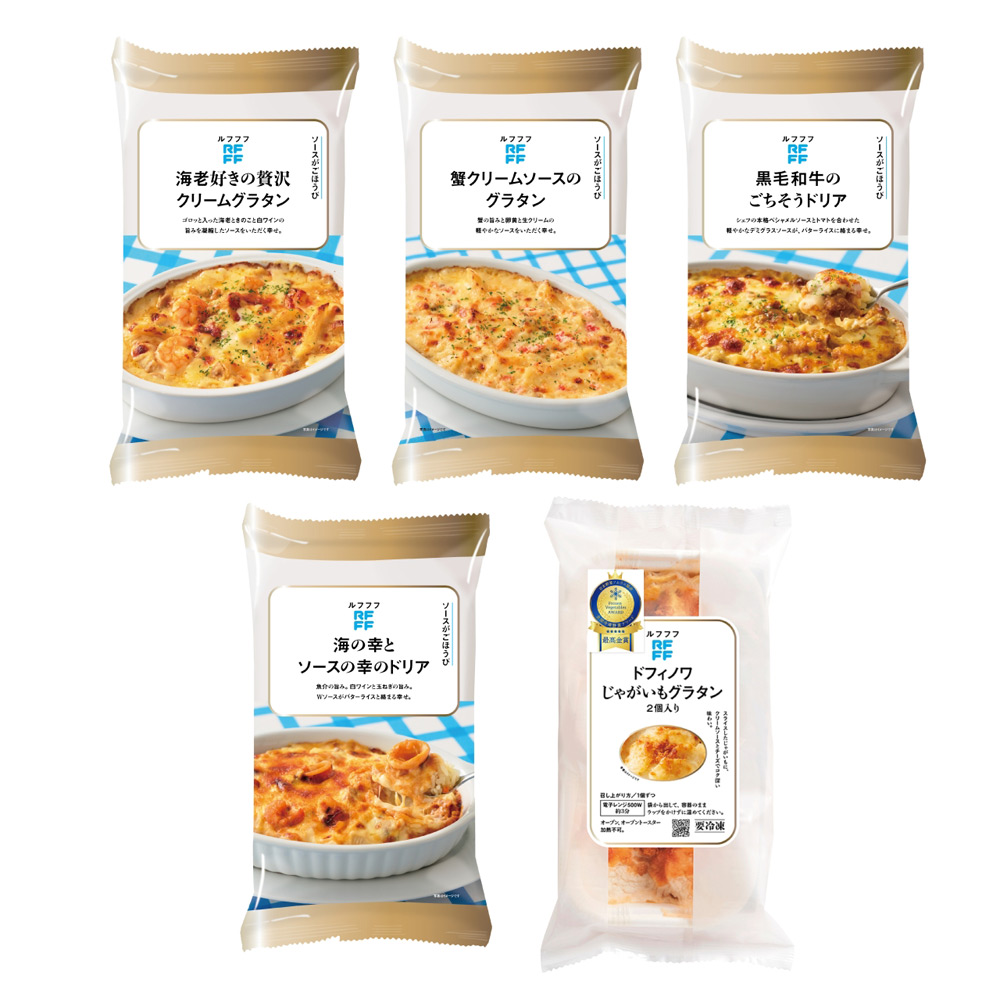 海老好きの贅沢クリームグラタン(210g)、蟹クリームソースのグラタン(210g)、黒毛和牛のごちそうドリア(260g)、海の幸とソースの幸のドリア(260g)、ドフィノワ じゃがいもグラタン 2個入り(200g)×各1