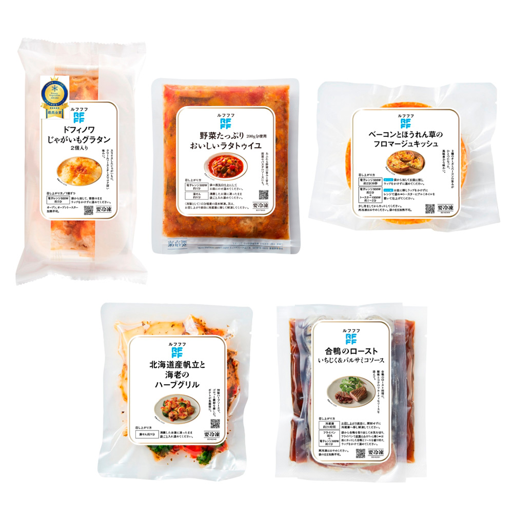 北海道産帆立と海老のハーブグリル(150g)、合鴨のロースト いちじく&バルサミコソース(220g:合鴨のロースト150g/いちじく&バルサミコソース70g)、ベーコンとほうれん草のフロマージュキッシュ(160g)、ドフィノワ じゃがいもグラタン 2個入り(200g)、野菜たっぷり200g分使用 おいしいラタトゥイユ(180g)×各1