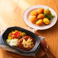 ハンバーグ、サフランライス、クリーミーポテトの3つの料理を一度に味わえる、味わいもボリュームも満足感のあるハンバーグプレートに、北海道産とうもろこしのプチクリームコロッケをセットにしました。ハンバーグプレートにとうもろこしのプチクリームコロッケを添え、洋食プレートとしてもお楽しみいただけます。