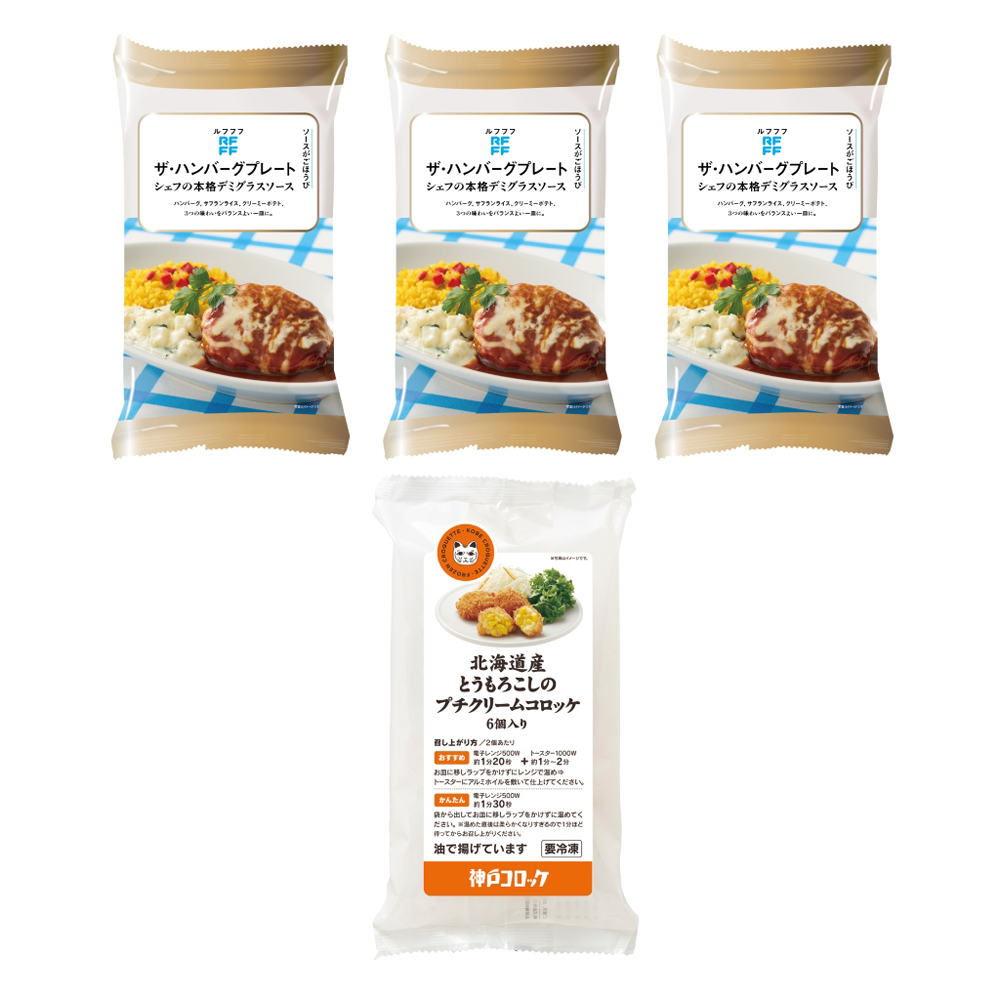 ザ・ハンバーグプレート シェフの本格デミグラスソ-ス(265g)×3、北海道産とうもろこしのプチクリームコロッケ 6個入り(180g)×1