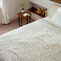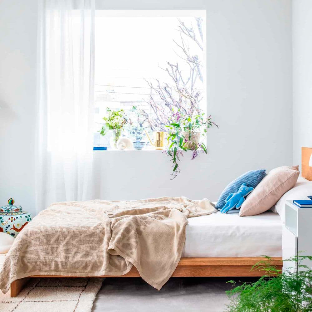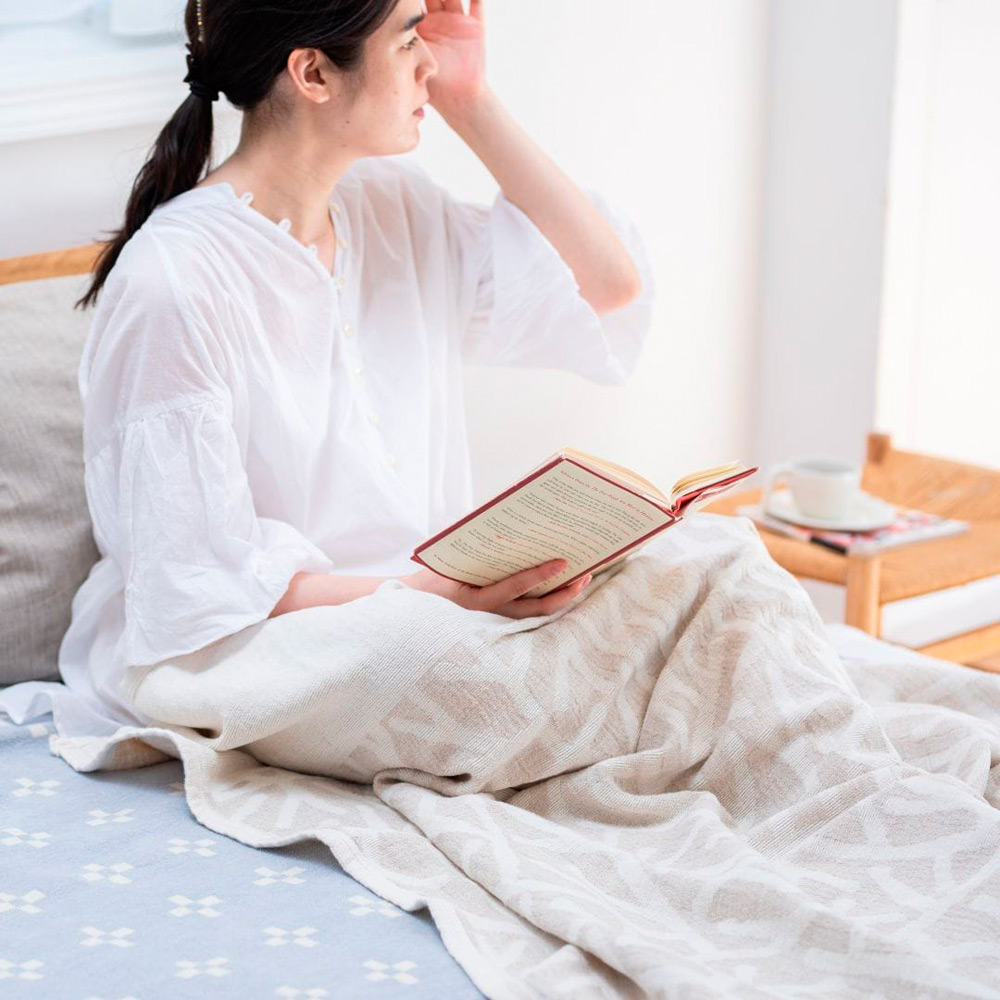 リネンの使うほど肌に馴染む風合いと、シュニールコットンのしっとりとした肌触り。この二つの素材の良さを持ち合わせたブランケットです。よつめ染布舎の型染作家、小野豊一さんが、吾亦紅(われもこう)のシンプルで不思議な形に魅せられ、それをモチーフに描いたモダンな和模様が特徴です。