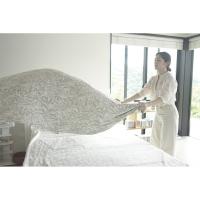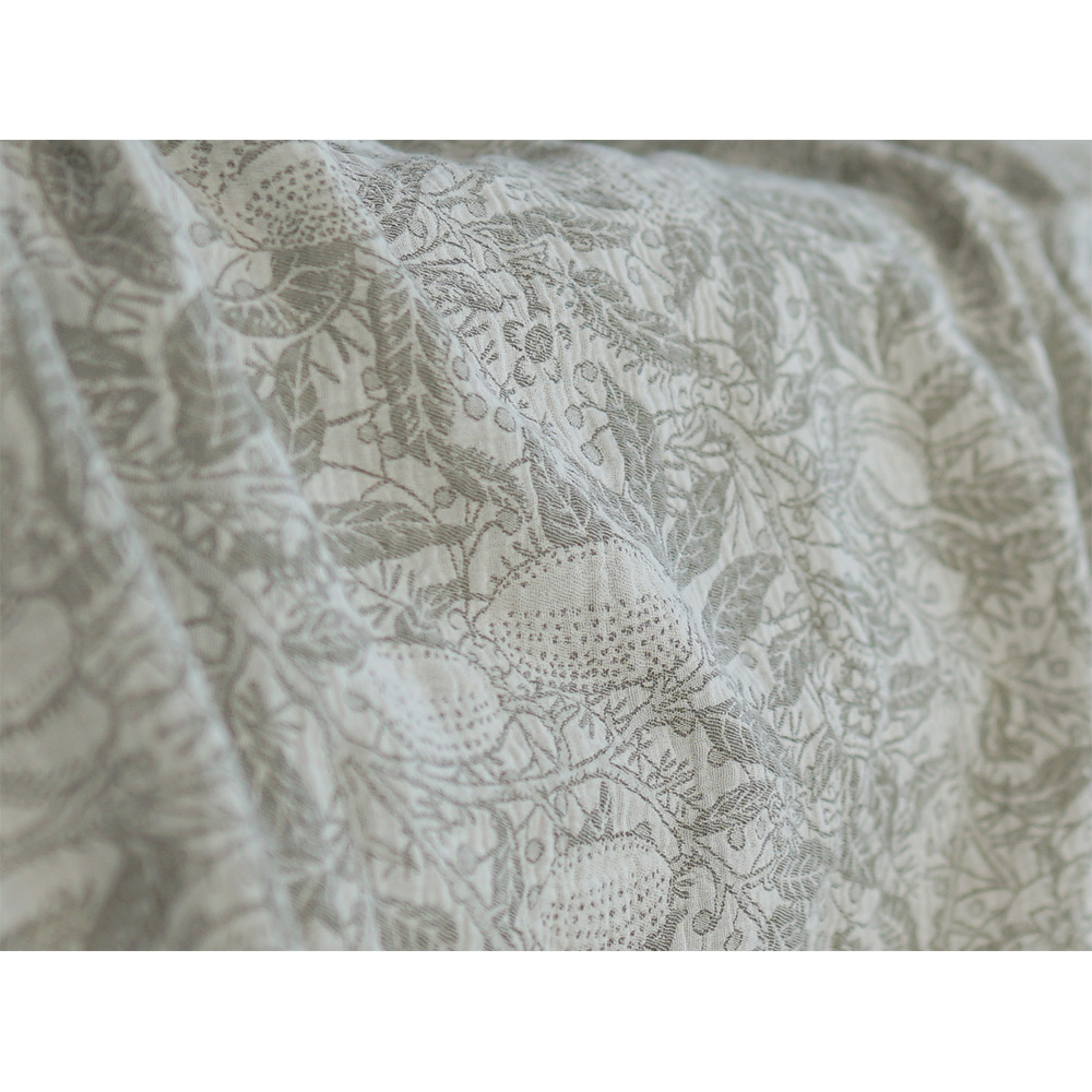 ウィリアム・モリスの芸術的なデザインとKLIPPANの熟練の技が溶け合う、心ときめくガーゼブランケット。ザクロや柑橘類、葉や枝が複雑に絡み合う様子が、優雅に描き出される「フルーツ」は、モリスの代表作のひとつ。KLIPPANは単色で緻密なデザインを表現、シックなスローへと仕上げました。ガーゼのようにふんわり軽いコットンスローは、まるで空気を纏うような軽やかさが魅力です。生地の表面に施された「ちぢみ織り」のような凹凸が、肌との間に風の通り道を作り、汗ばむ季節もさらりと快適な質感を保ちます。肌掛けとしてはもちろん、大判のストールとして肩に掛けたり、ソファに無造作に掛けてインテリアのアクセントにしたり。海辺で水着の上に羽織ったりと、アウトドアでも活躍します。テーブルクロスとして使うのもおすすめ。シックで洗練された一枚が、暮らしのあらゆるシーンを彩ります。