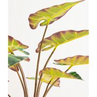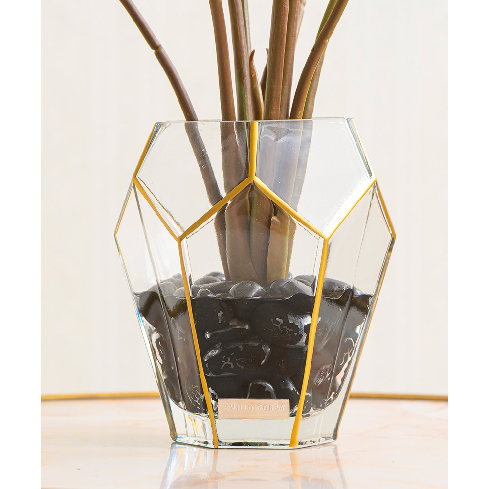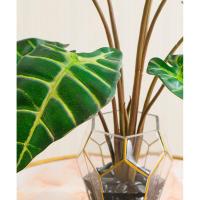 力強い生命力を感じるアロカシアの葉を、ゴールドの縁取りが美しい多面体ガラスに閉じ込めました。熱帯の空気感を纏いながらも、その佇まいはどこか知的でモダン。光を反射するガラスベースが、お部屋に奥行きと透明感を与えます。水やりを気にせず、どんな場所でも理想のグリーンを楽しめるのは、高品質なアートグリーン(造花)ならではの贅沢です。大理石のテーブルや、クラシックなインテリアのアクセントに。