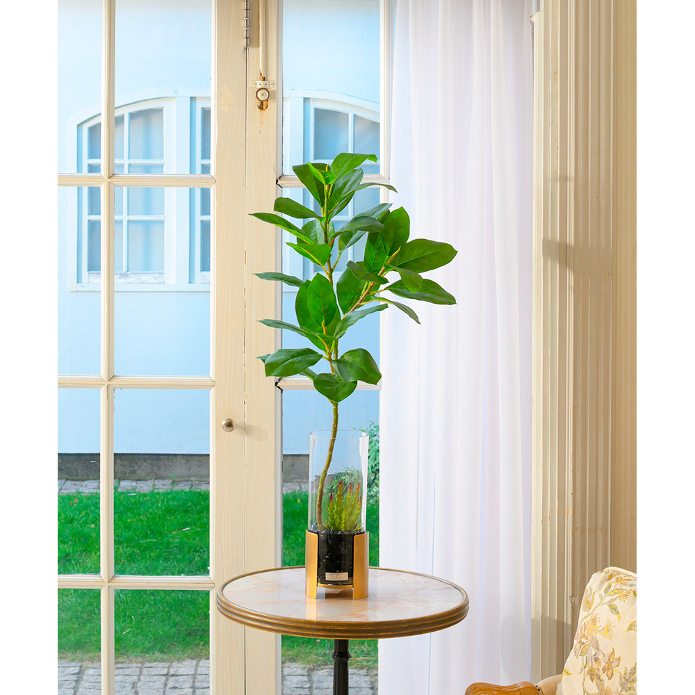 「最も美しい」という意味を持つフィカスアルテシーマ。その名の通り、鮮やかで生命力に満ちたグリーンの葉が、インテリアに心地よいリズムを生み出します。すらりと伸びた幹と、風に揺れるような軽やかな葉の配置は、エミリオ・ロバの熟練した技術によるもの。ゴールドの輝きを放つベーススタンドが、ナチュラルなグリーンに都会的なエッセンスを加え、置くだけでホテルのラウンジのような洗練された空間を演出します。中型サイズながら、ガラスベースの透明感が圧迫感を感じさせず、お部屋に開放感を与えてくれます。