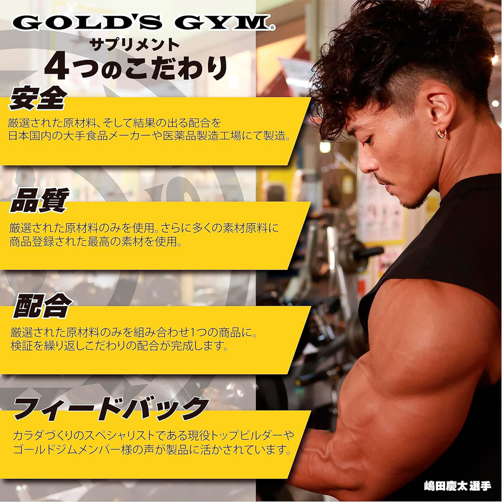 WPIホエイを使用ホエイプロテインに使用されるホエイ原料は主に2種類(WPCとWPI)あります。ゴールドジムホエイプロテインは、たんぱく質含有量が多いWPI(分離ホエイプロテイン)を使用、たんぱく質の含有量が多い分、脂肪分は少なくなり、結果としてたんぱく質補給が可能となります。たんぱく質80%以上ゴールドジムホエイプロテインのたんぱく質含有量は身体づくり※のために必要なたんぱく質をしっかり摂取できるよう無水物換算値(水分を除いた場合の数値)で80%以上(83.4%~86.1%)。ホエイペプチド配合ホエイプロテインを分解し消化吸収までのスピードを高めたホエイペプチドを配合。ゴールドジムホエイプロテインは摂取のタイミングも考え設計されています。ビタミンB群は水溶性ビタミンのため体にストックすることができず、こまめに摂取する必要があります。また、たんぱく質摂取後の身体づくり※に利用されるように調整役としても働きます。ゴールドジムホエイプロテインは7種類のビタミンB群を配合し、プロテイン摂取後の身体のことも考え設計されています。大さじ山盛り1杯で約10~15g 運動量や目的に合わせ、1回20~30gを目安にコップ1杯(約205cc)の牛乳やジュース、 水などに溶かしてすみやかにお飲みください。※健康的な身体の維持のこと