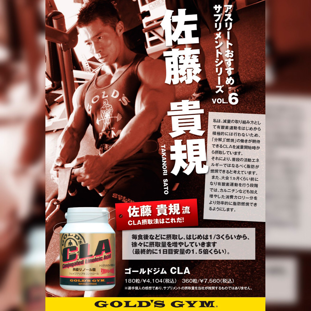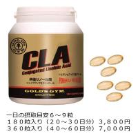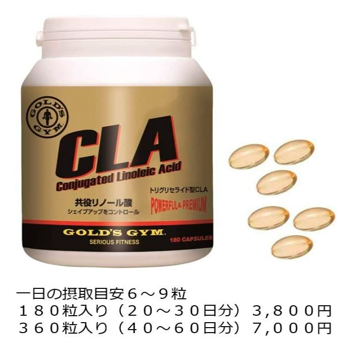 トリグリセライド型CLA近年、ベニ花由来のトリグリセライド型CLAが開発されました。これは、従来の脂肪酸型CLAに比べ風味が良く、吸収速度が速いことが特徴です。ゴールドジムのCLAはトリグリセライド型のCLAを使用しています。栄養補助のため、1日6~9粒を目安に、水などと一緒にお摂りください。摂取タイミング:食後。