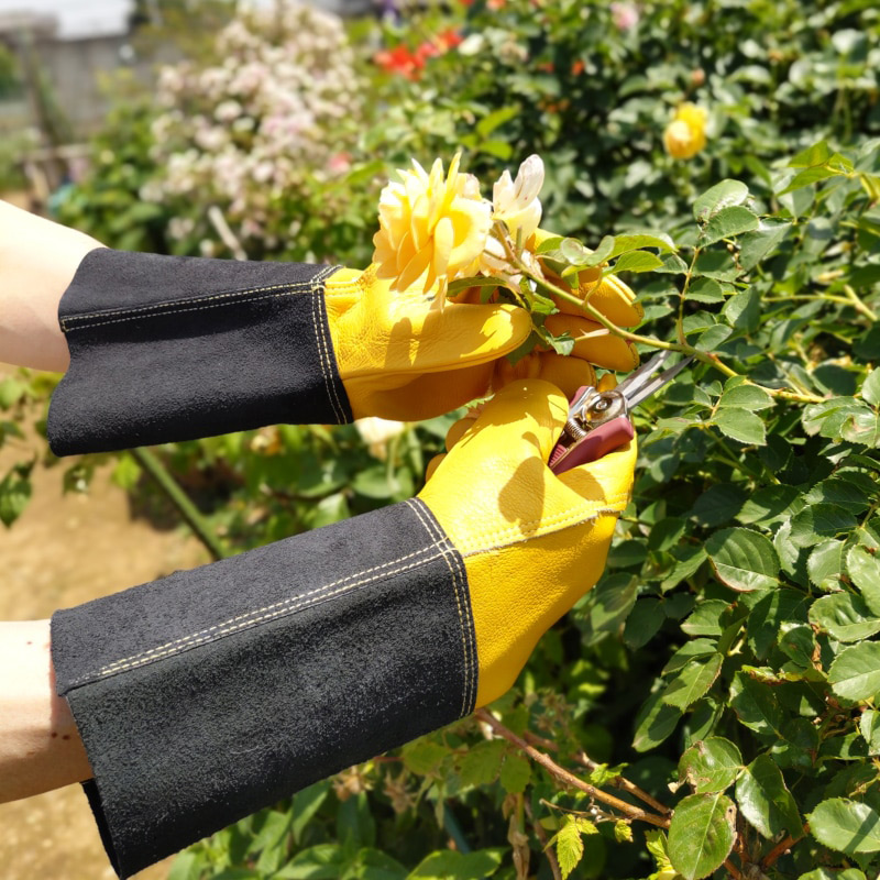 スエードの袖口が腕や手をしっかり保護し、あらゆる作業にも耐えるような強度を持っています。手の平・手の甲部分にはゴールデンイエローのカラーが目を惹くやわらかくしなやかなレザー素材を使用し、快適に作業をすることができます。