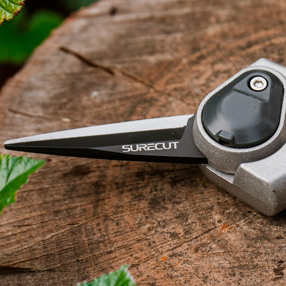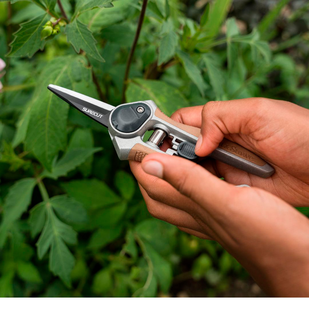 コンパクトで細身のスリム刃は、狭い場所にもスッと入り込んで、ピンポイントでのカットができる細かな作業に最適です。繊細な剪定やハーブの収穫、花がら摘み、切り花のカット、果実の収穫などに。さらに直径6mmまでカットできるので、植物の芽を間引いたり、観葉植物の細やかな剪定や、きゅうりやなすなどの収穫にも使えます。 また、両刃タイプで断面がきれいなので盆栽の芽切鋏としてもおすすめです。使いやすいから作業効率アップ。ハンドルは手にフィットしやすく、握りやすさと滑りにくさを両立。切れ味のよい高炭素鋼のブレードに加えて、Kent&Stowe独自のSureCutテクノロジー(※1)が搭載されているので、軽い力でスパッと気持ちよくカットできます。女性の手にもすっぽり収まるサイズ感と約151gの軽量モデルで長時間のガーデニング作業でも使いやすいのが嬉しいポイント。刃のロックは直感的に使えるスライド式で、初心者の方にも適しています。高炭素鋼は錆びにくく、耐久性にも優れているので、長くご愛用いただけます。Kent&Stoweの洗練されたデザインで見た目も使い心地もワンランク上の剪定ばさみは使う度に愛着がわき、ガーデニング時間をもっと楽しくしてくれそう。持ち手部分に吊り下げループ付きなので、紐を通せばぶら下げて収納できて便利。使いやすさとスタイル、どちらもこだわりたいガーデナーにぴったり。 ※1 SureCutテクノロジーKent&Stoweが採用している独自の刃設計・切断技術。鋭く精密なブレード加工により、スパッと切れる気持ち良いカットを実現し、少ない力でキレイに、確実にカットできる技術のこと。