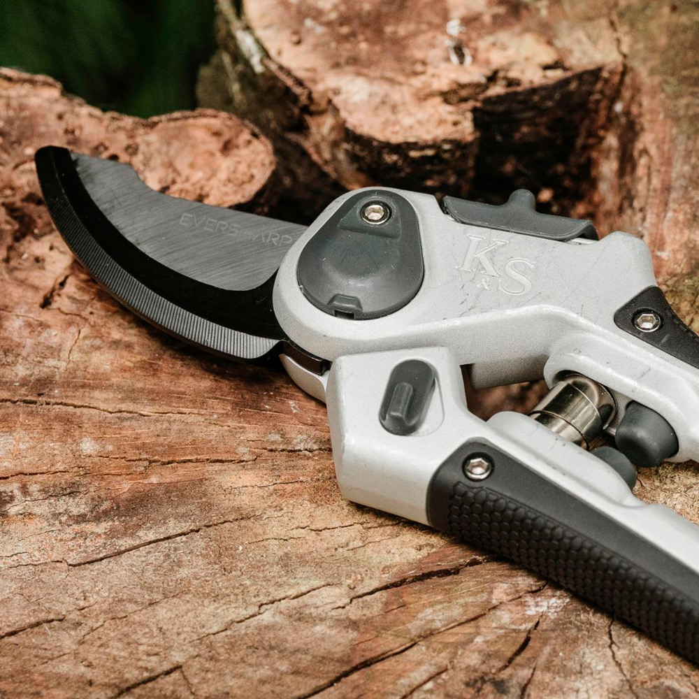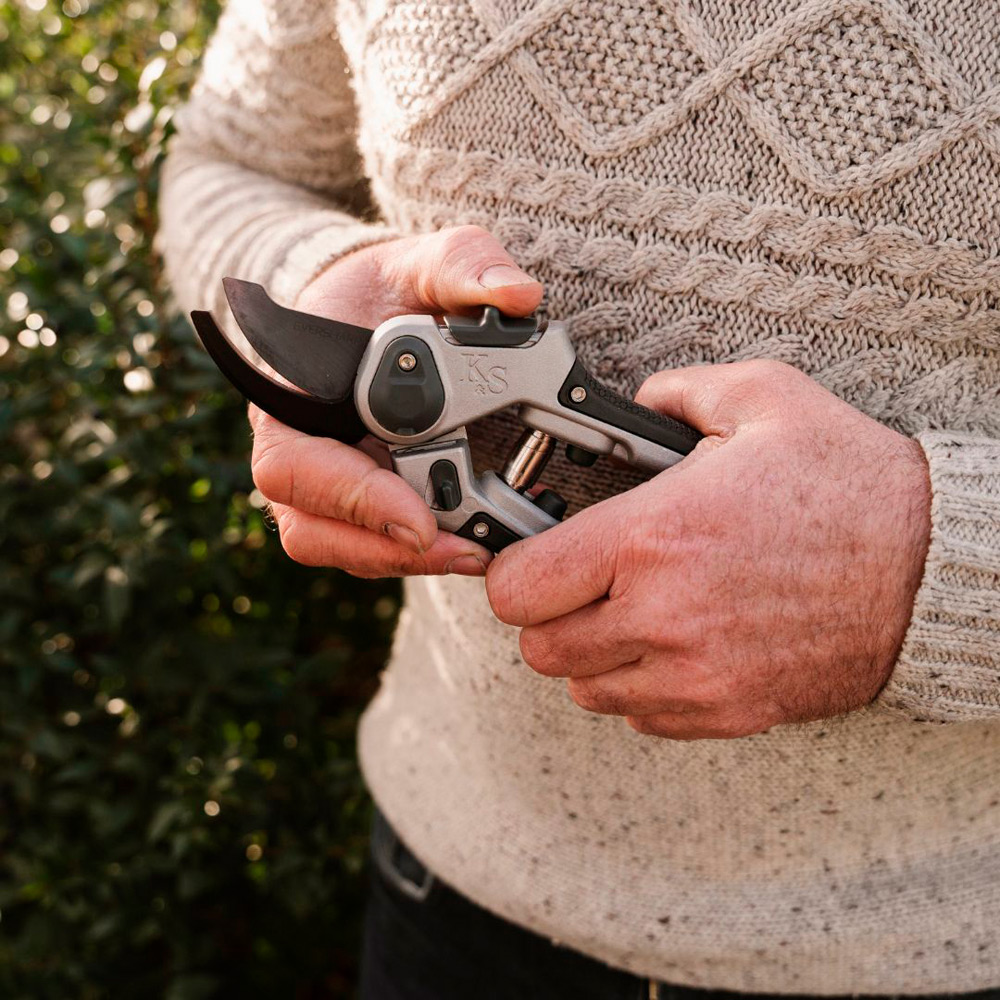 握りやすくてよく切れるK&S(ケント&ストー)のエバーシャープシリーズは抜群の切れ味が持続する剪定ばさみ。高炭素鋼の刃は硬質でワイヤーカッターとしても使用でき、ガーデニングだけでなく様々な場面で活躍します。また硬度が高いので錆びにくく長持ちします。さらに握りやすくて滑りにくいグリップは快適な作業を助けてくれます。 直径24mmの枝までOK。ハンドルのスパンは2段階に調整可能で切る枝の太さや、手の大きさなど、用途に合わせて使う事ができます。また、左利きの方でも使えるユニバーサルデザインで、親指で簡単に操作できるセーフティーロック付き。24mmまでの枝をスパッと切断できるので、剪定作業も楽しい時間になりそう。生木や若木、挿し木の剪定、バラや低木の枯れ葉処理に適しています。持ち手部分には吊り下げ穴が空いているので、使わない時はフックなどにかけて収納することもできます。デザイン性に優れているので、コレクションのようにわざと見えるように収納しても素敵です。K&S(ケント&ストー)のエバーシャープシリーズは英国でデザイン及び製造された英国製。英国はもちろん世界のガーデナーに愛されるKent&Stoweならではのデザインは機能性だけでなく、伝統的かつ先端的。高級感がありスタイリッシュな剪定ばさみはガーデニングを楽しむ方に喜ばれるアイテムです。