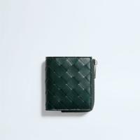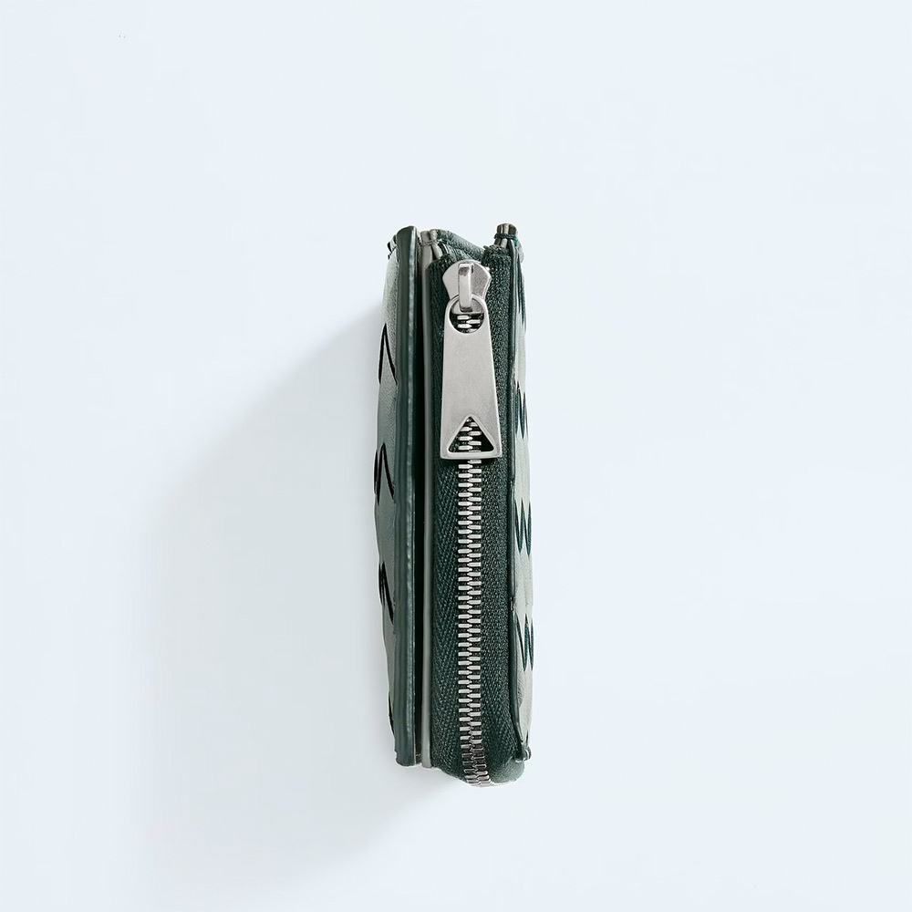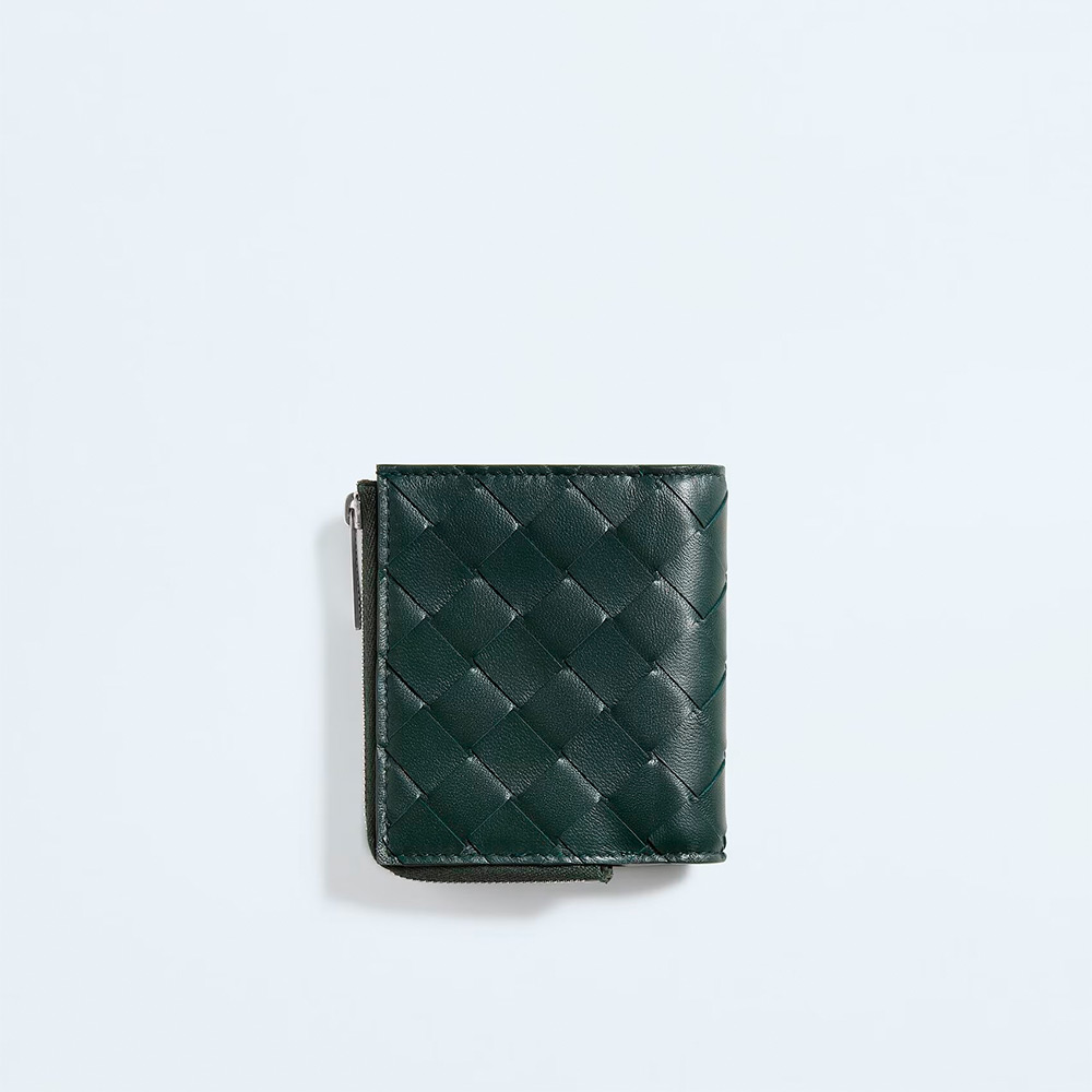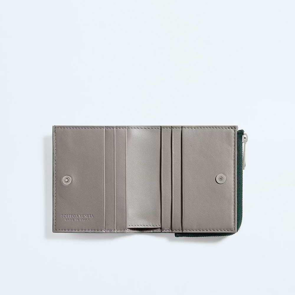 内側にコントラストカラーを配した、イントレチャートカーフレザーの二つ折りスモールウォレットです。