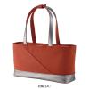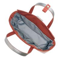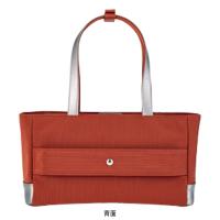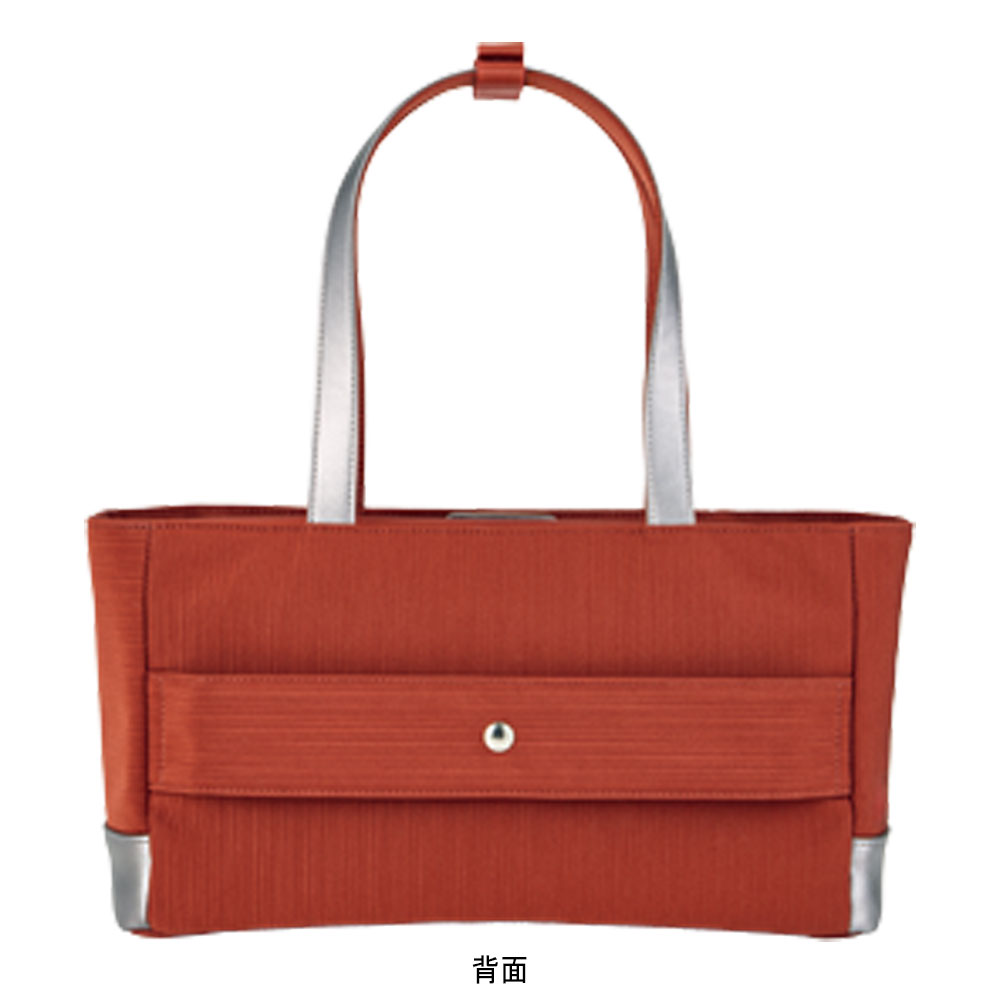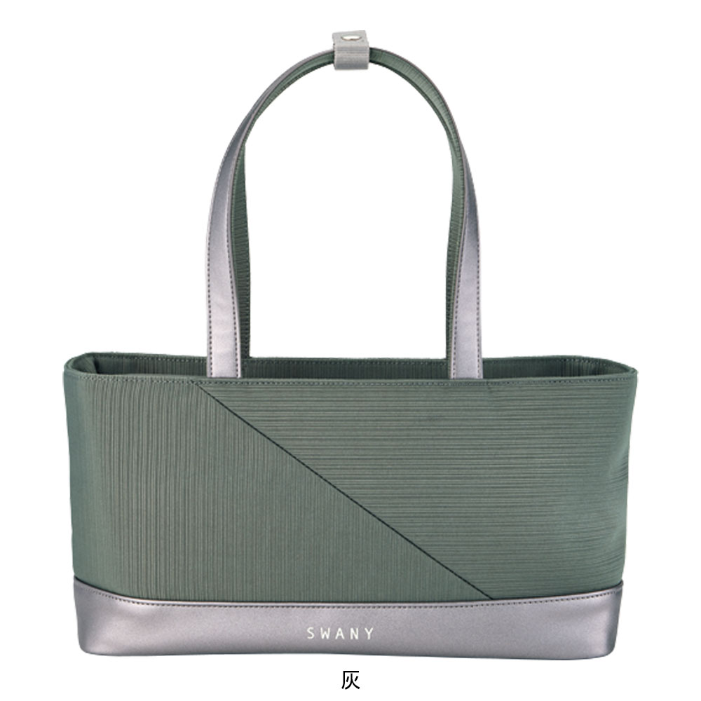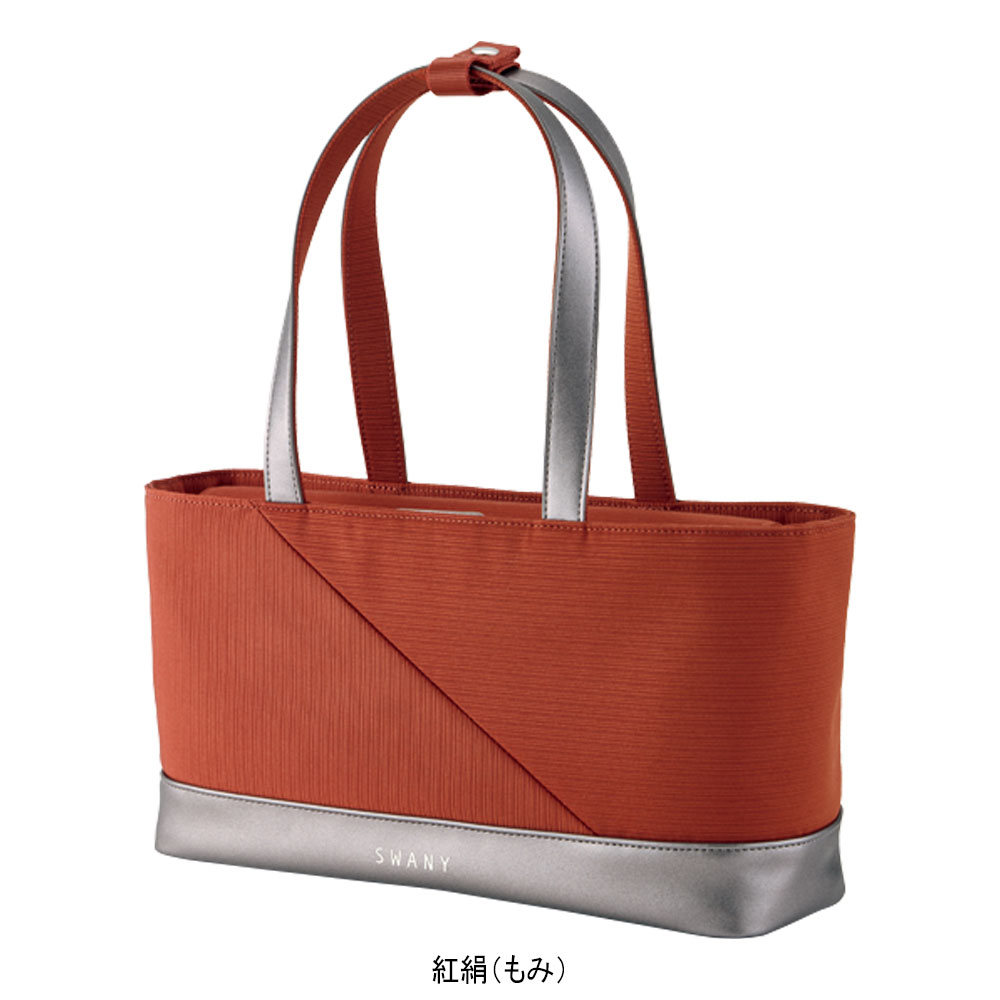 スクエア型のすっきりとしたトートバッグ。背面のベルトでカートのハンドルに取り付けて持ち運ぶこともできます。プリーツのような表情のある生地とメタリックな生地を組み合わせたおしゃれな切り替えデザインが、単体でも存在感を放ちます。