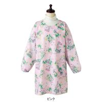 庭園に咲き誇る花々をプリントしたエレガントで華やかなかっぽう着。シワになりにくくケアが容易なポリエステル素材です。肩回りがゆったりとしたラグラン袖です。