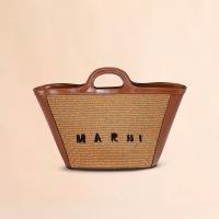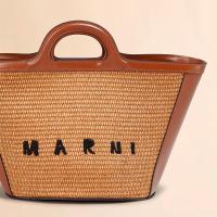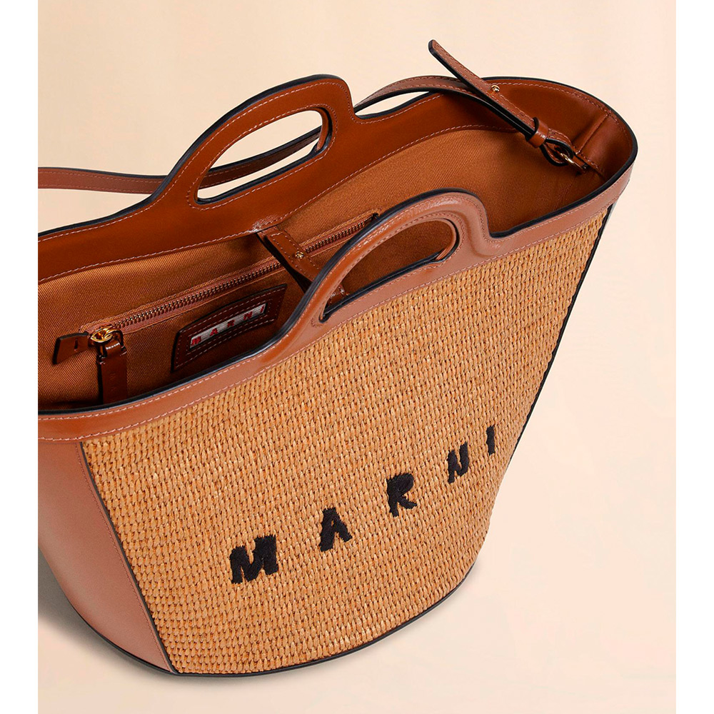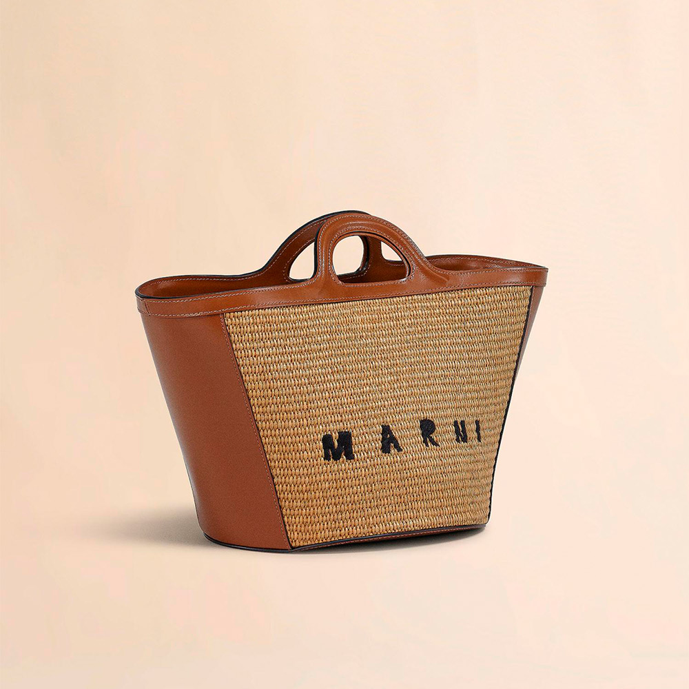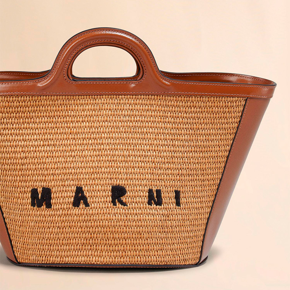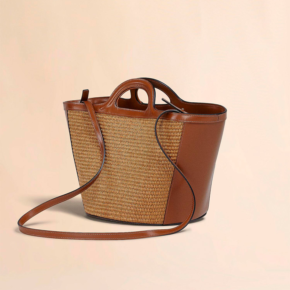 滑らかで光沢感のある編み込み生地とレザーで切り替えた「TROPICALIA」スモールバッグ。取り外し可能なレザーのショルダーストラップ、レザーのクロージャー付き。フロントに施されたロゴの刺しゅうがアクセントに。