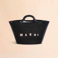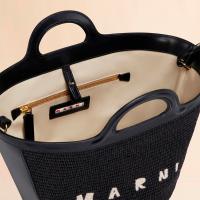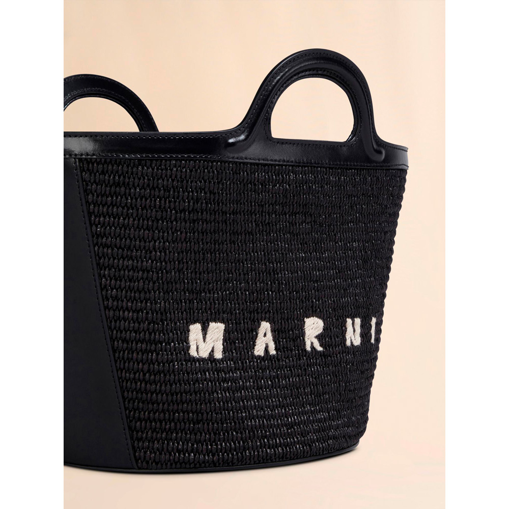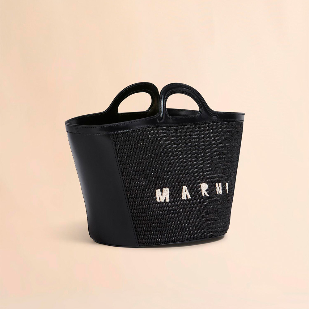 滑らかで光沢感のある編み込み生地とレザーで切り替えた「TROPICALIA」スモールバッグ。取り外し可能なレザーのショルダーストラップ、レザーのクロージャー付き。フロントに施されたロゴの刺しゅうがアクセントに。