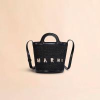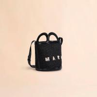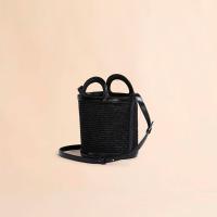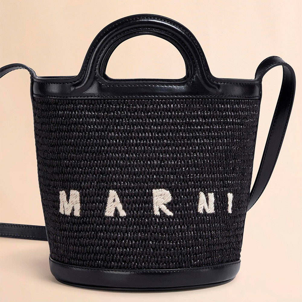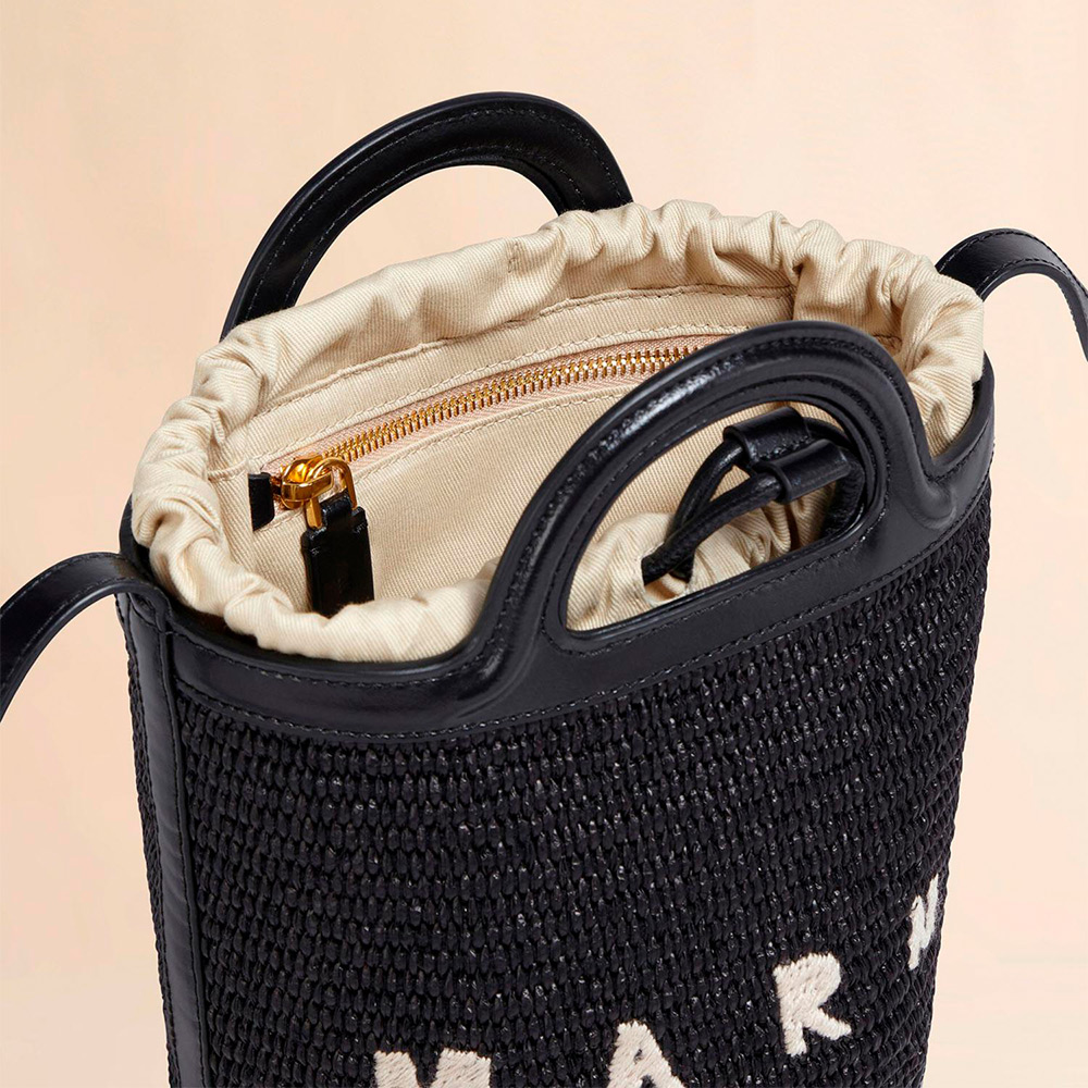 滑らかで光沢感がある編み込み生地とレザーで切り替えた「TROPICALIA」ミニバケットバッグ。布製の巾着、ショルダーストラップ付き。フロントに施されたロゴの刺しゅうがアクセントに。