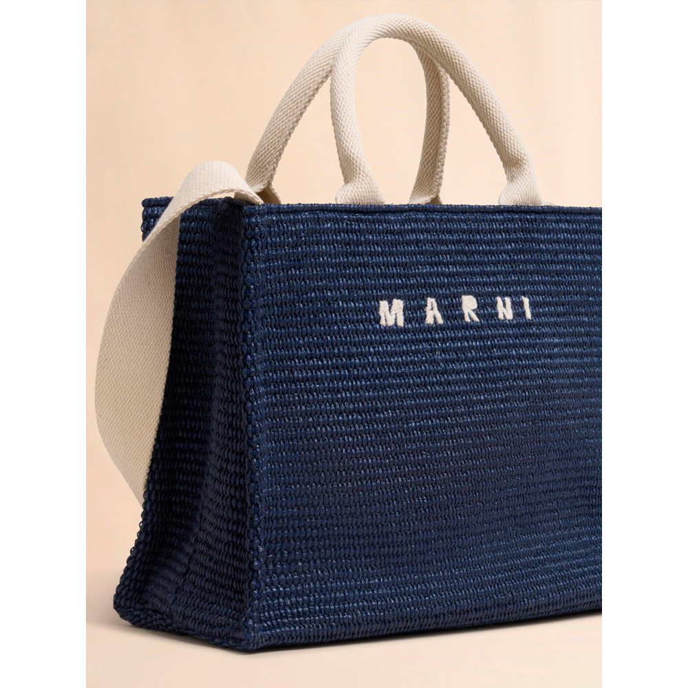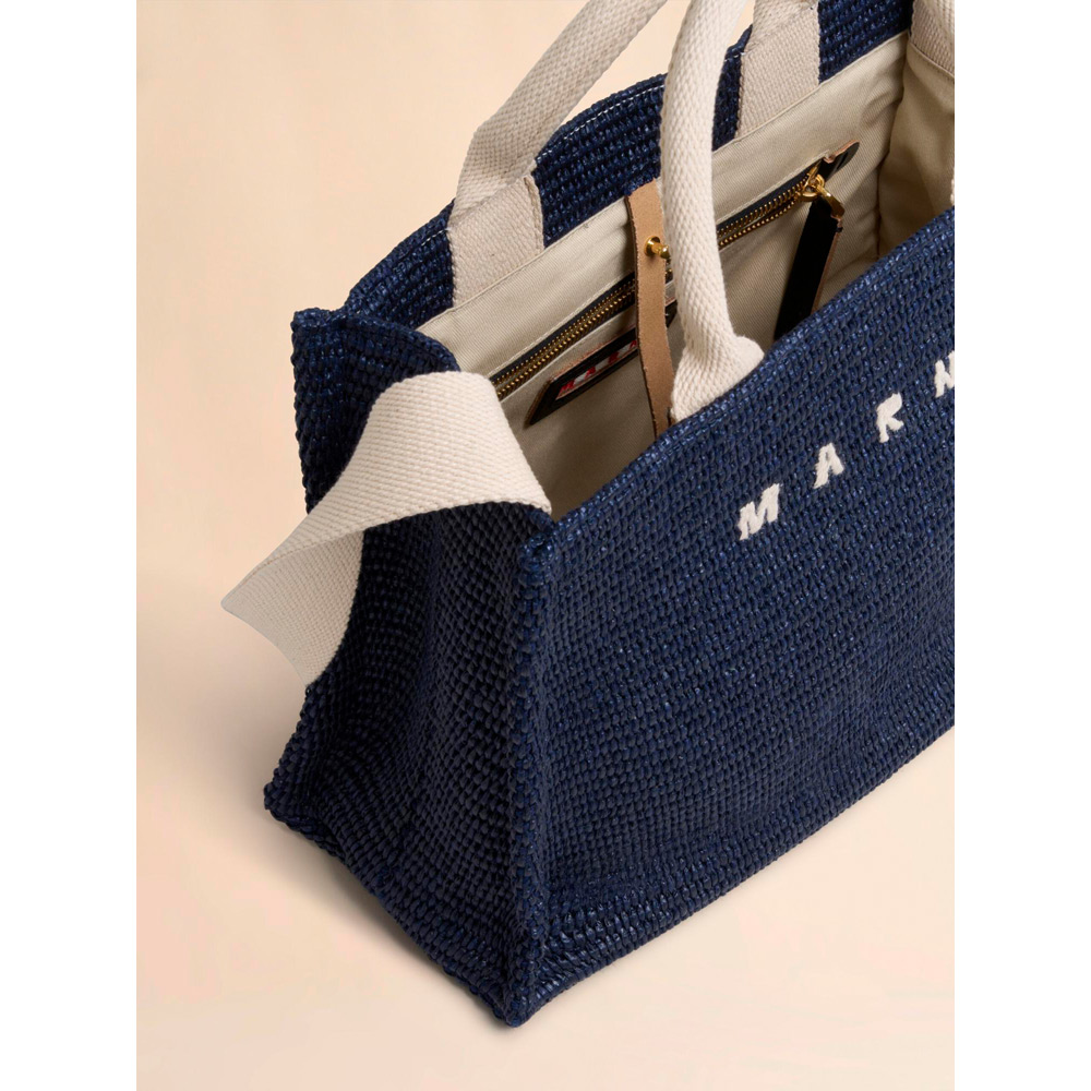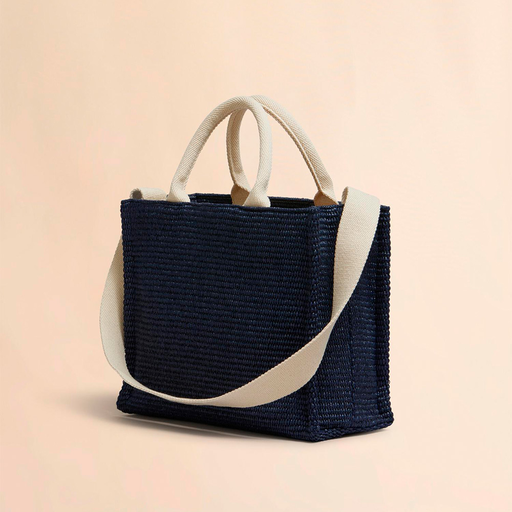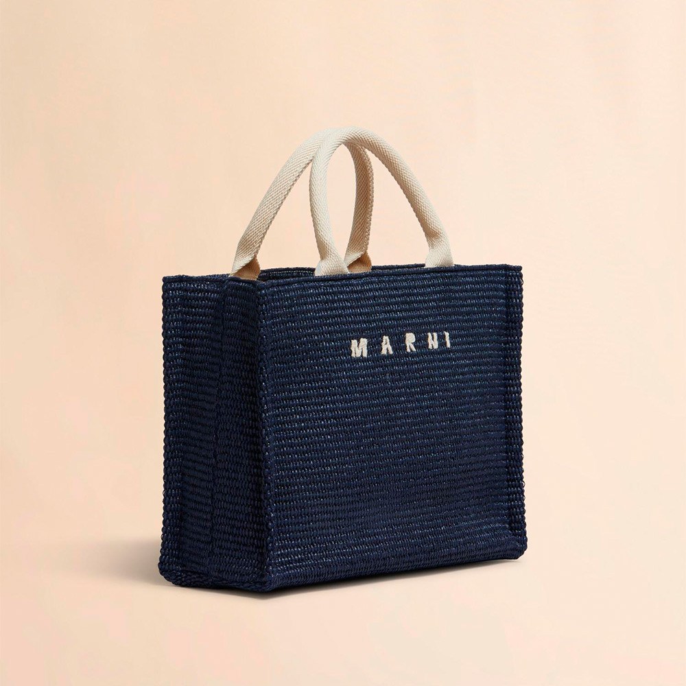 滑らかで光沢感がある編み込み生地のバスケットスモールバッグ。内側にジップポケット、ショルダーストラップ付き。フロントに施されたロゴの刺しゅうがアクセントに。