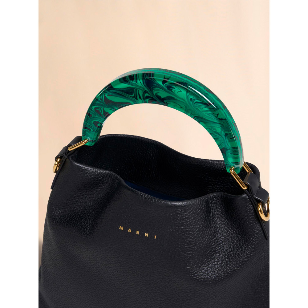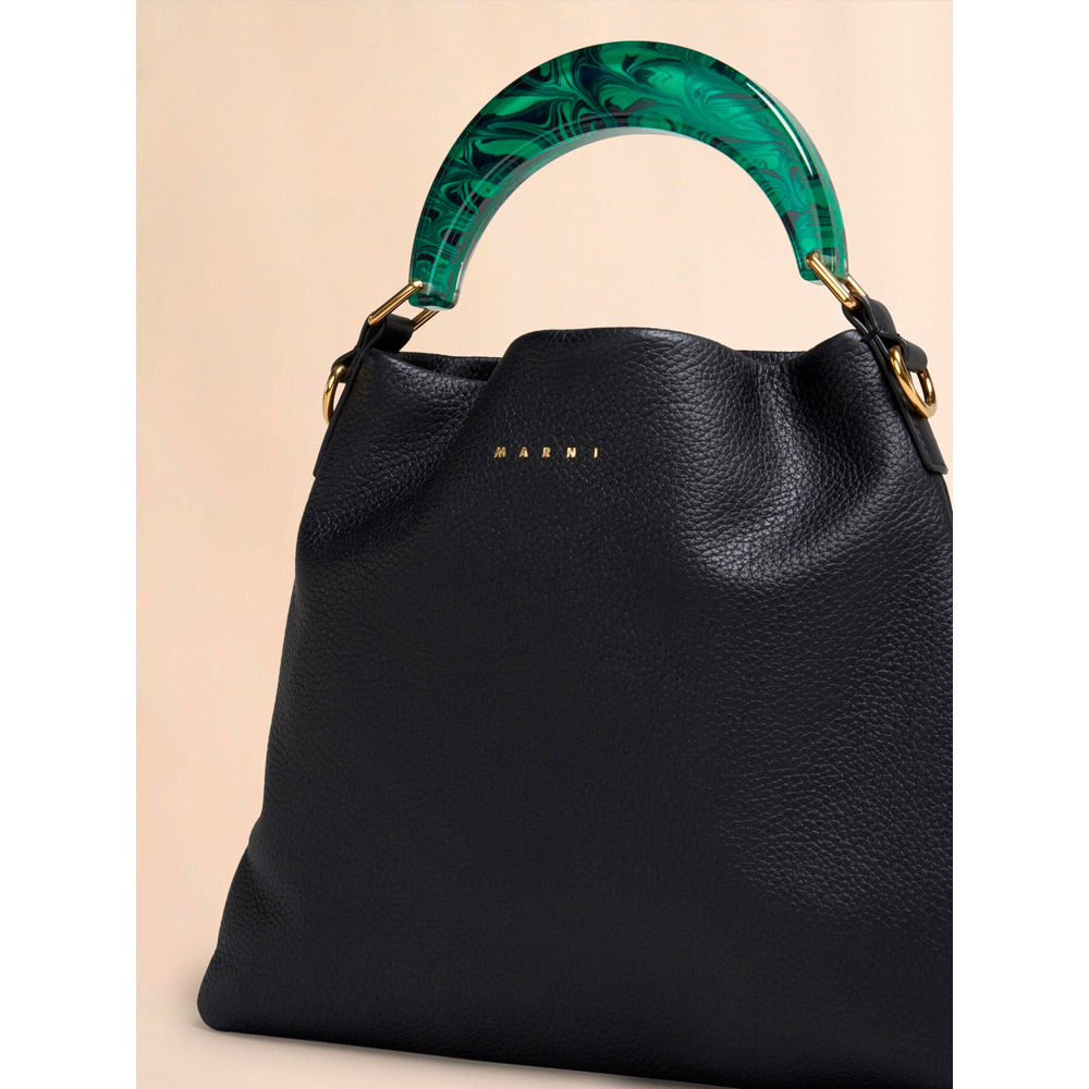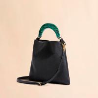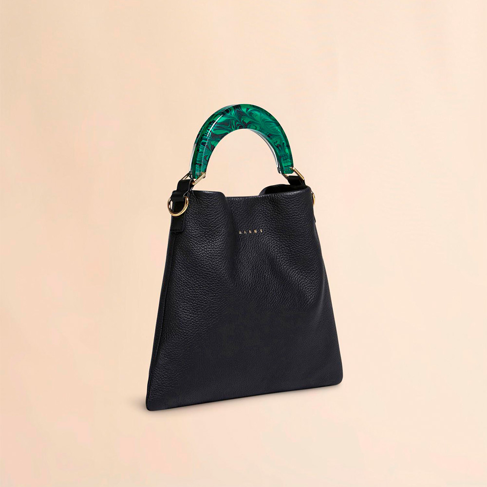 ソフトグレインカーフレザーのボディにレジンハンドルが付いた「VENICE」スモールバッグ。台形にデザインされたフロントにはロゴが施され、内側にはスロットポケット付き。取り外し可能なレザーショルダーストラップ付き。