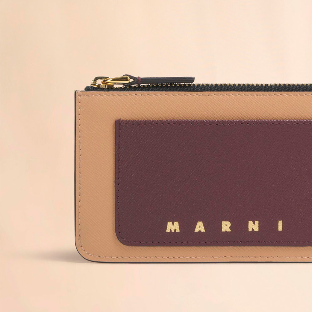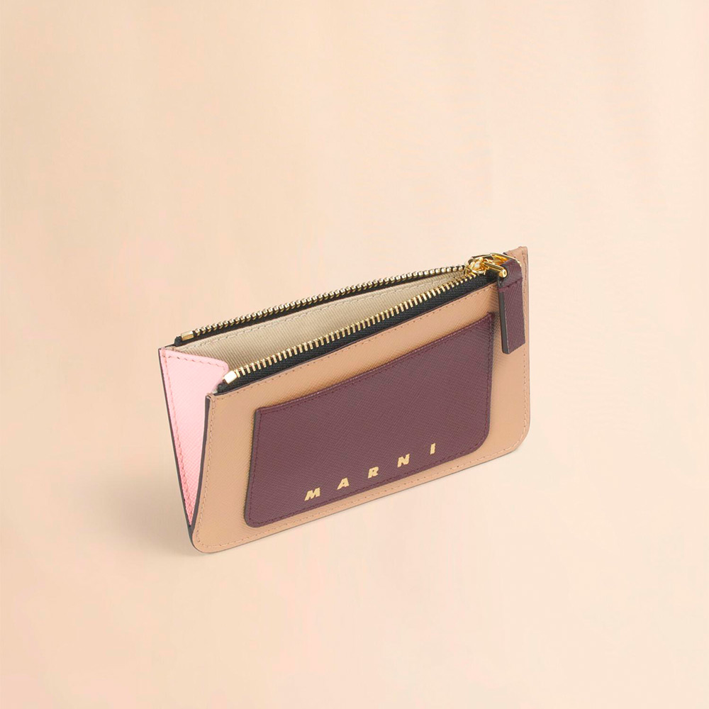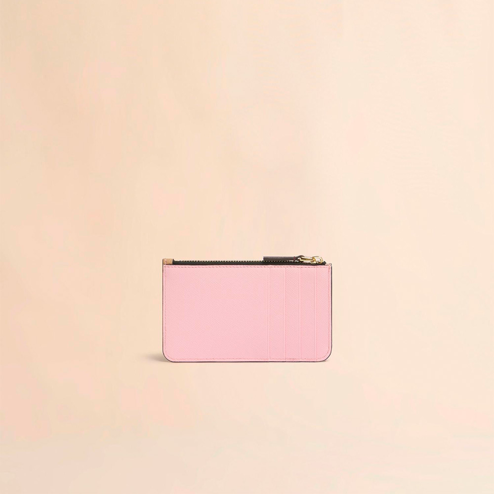 サフィアーノレザー製のカードケース。ファスナー式コインポケット1つ、背面にカードスロット4つ。フロントにロゴ入り。