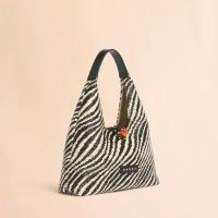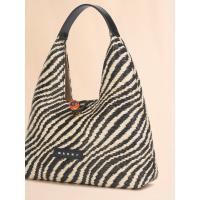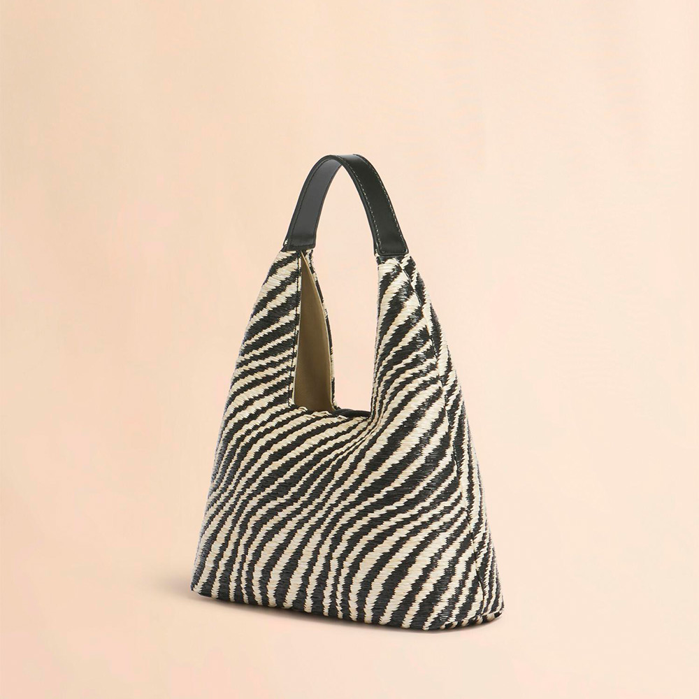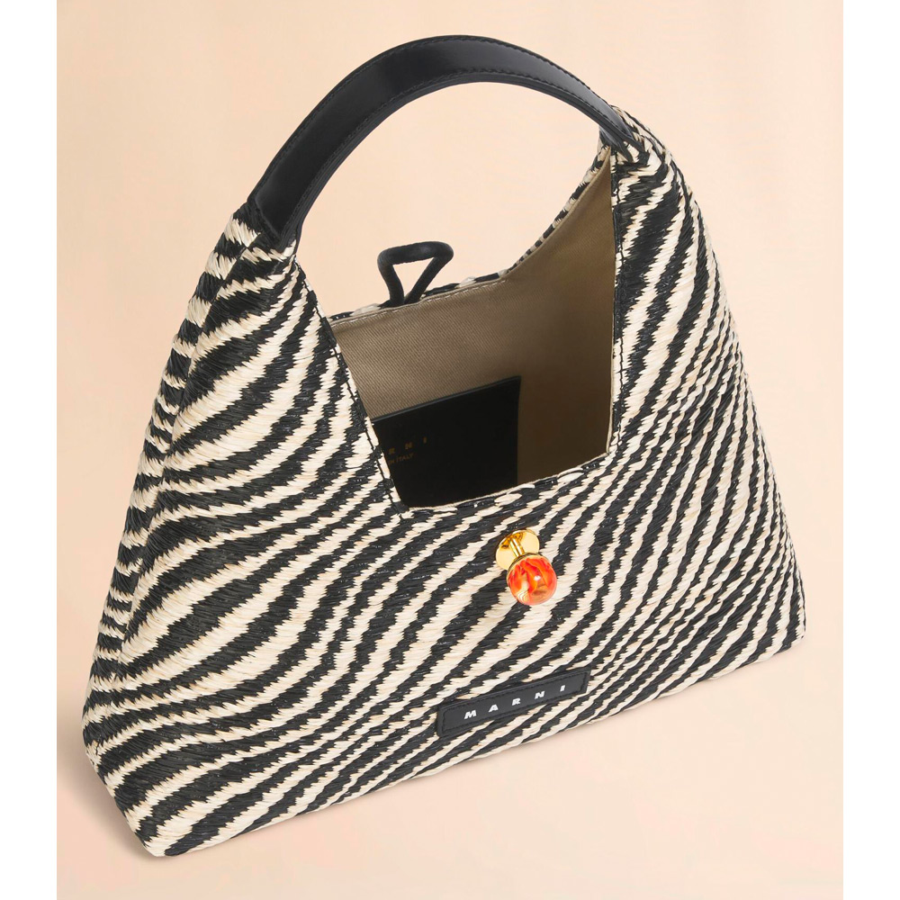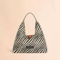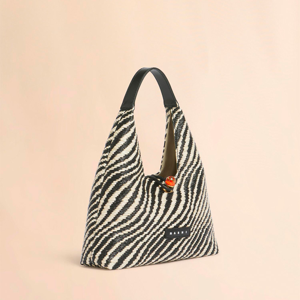 バイカラーのウェーブ柄が特徴的な「TRAPEZE」トップハンドルミニバッグ。台形型のシルエットとレザーのハンドル、フロントについたマーブルの金具がアクセントに。コンパクトながら必要なアイテムをスマートに収納可能。