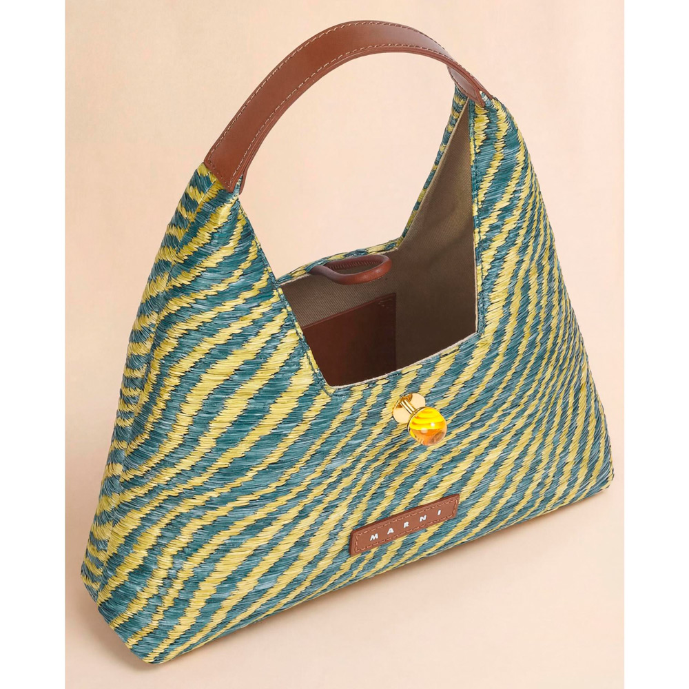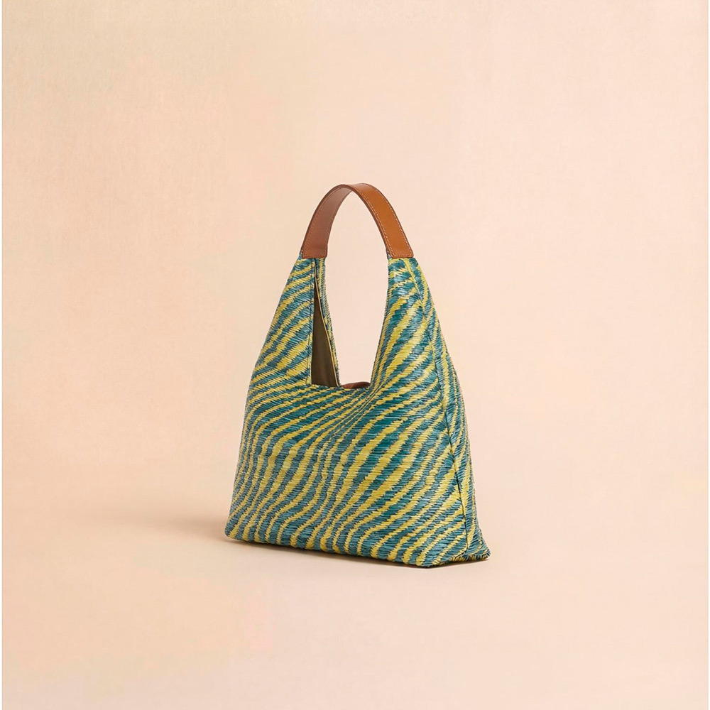 バイカラーのウェーブ柄が特徴的な「TRAPEZE」トップハンドルミニバッグ。台形型のシルエットとレザーのハンドル、フロントについたマーブルの金具がアクセントに。コンパクトながら必要なアイテムをスマートに収納可能。