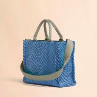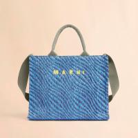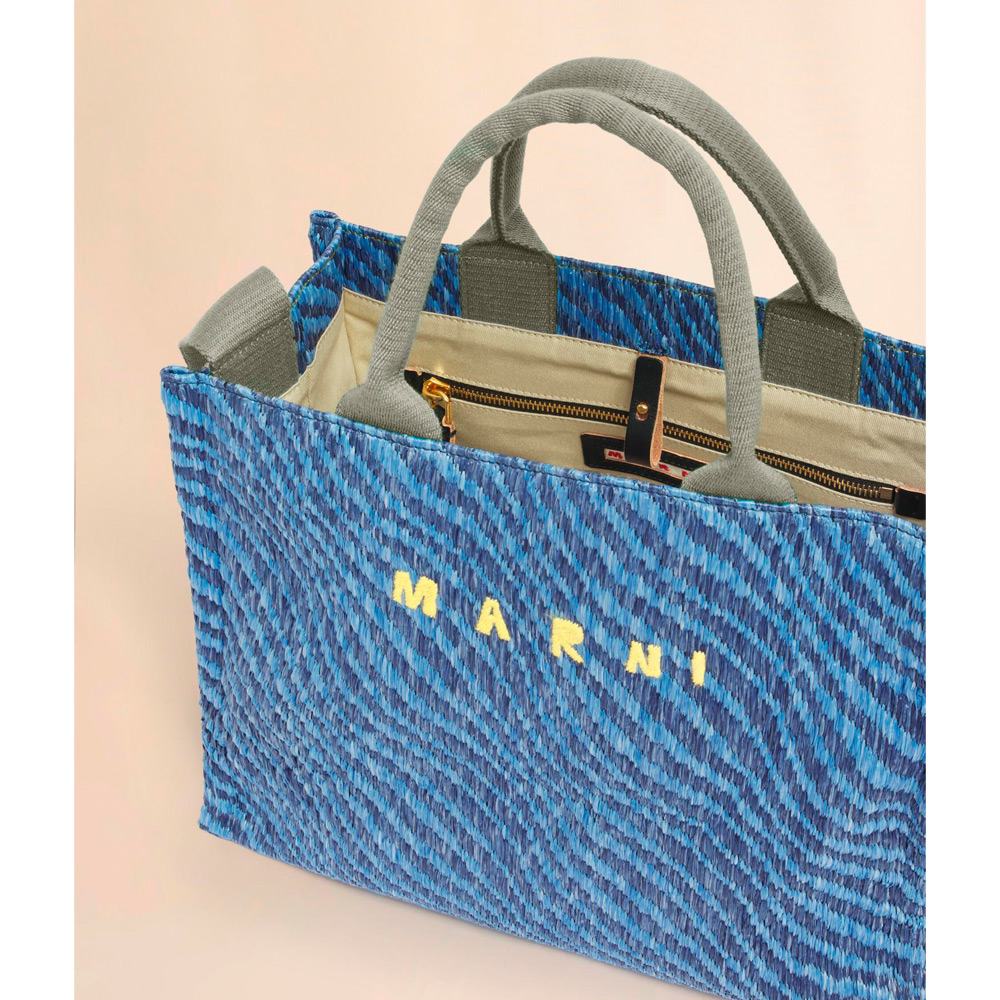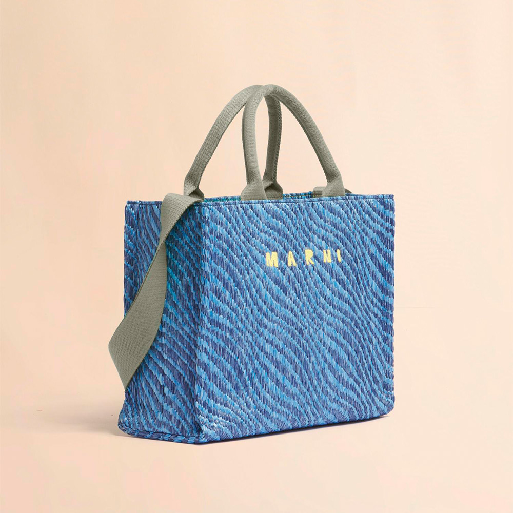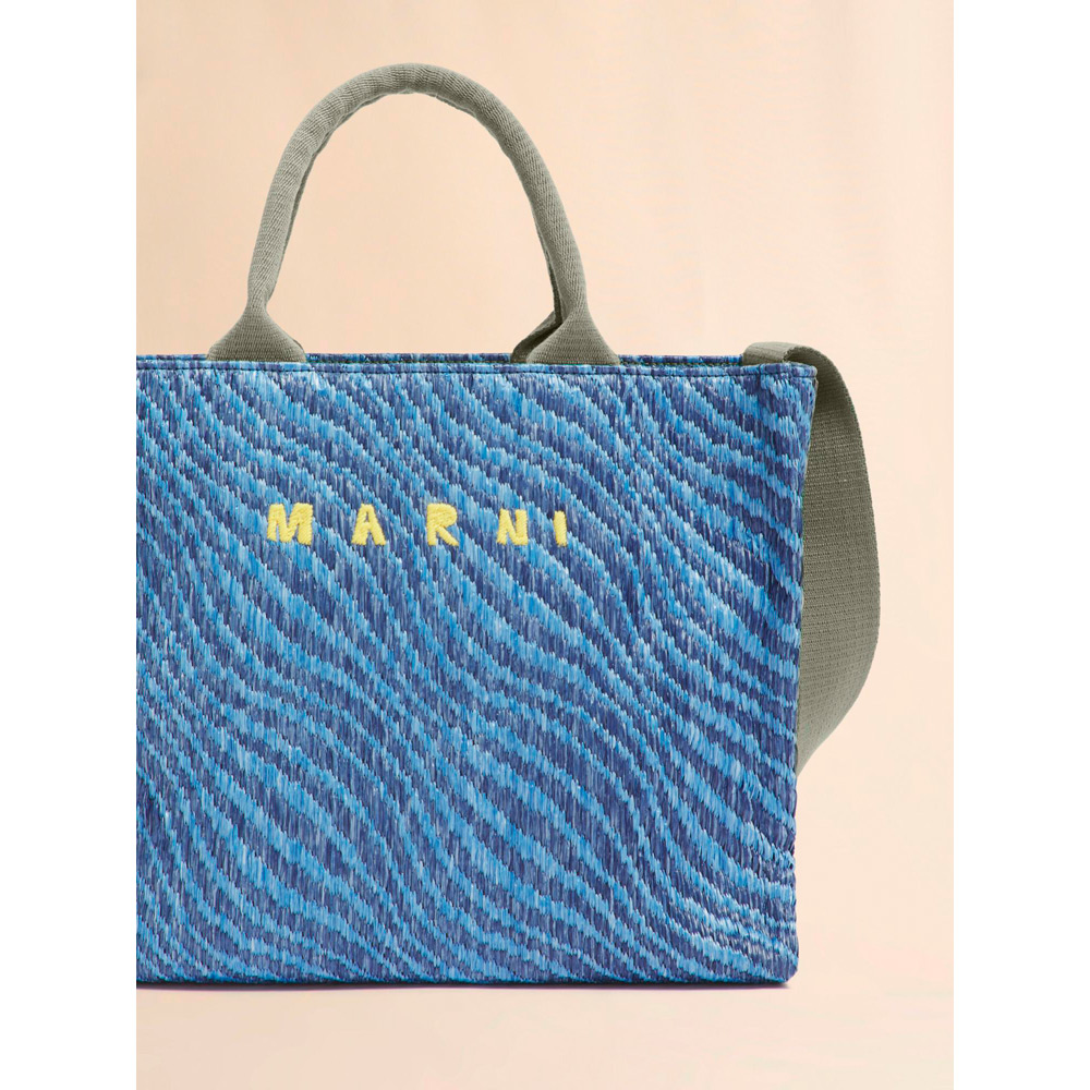 バイカラーのウェーブ柄が特徴的なバスケットスモールバッグ。内側にジップポケット、ショルダーストラップ付き。フロントにほどこされたロゴ刺しゅうがアクセントに。