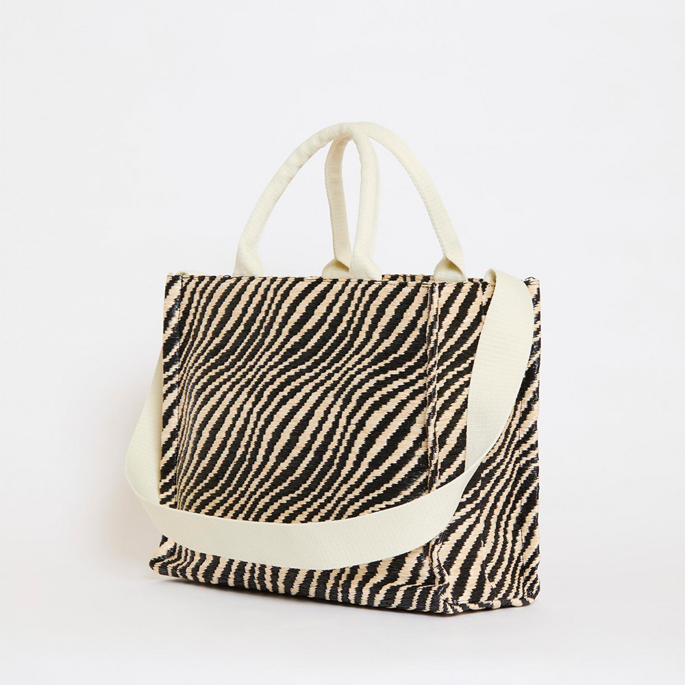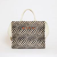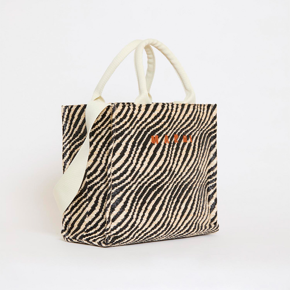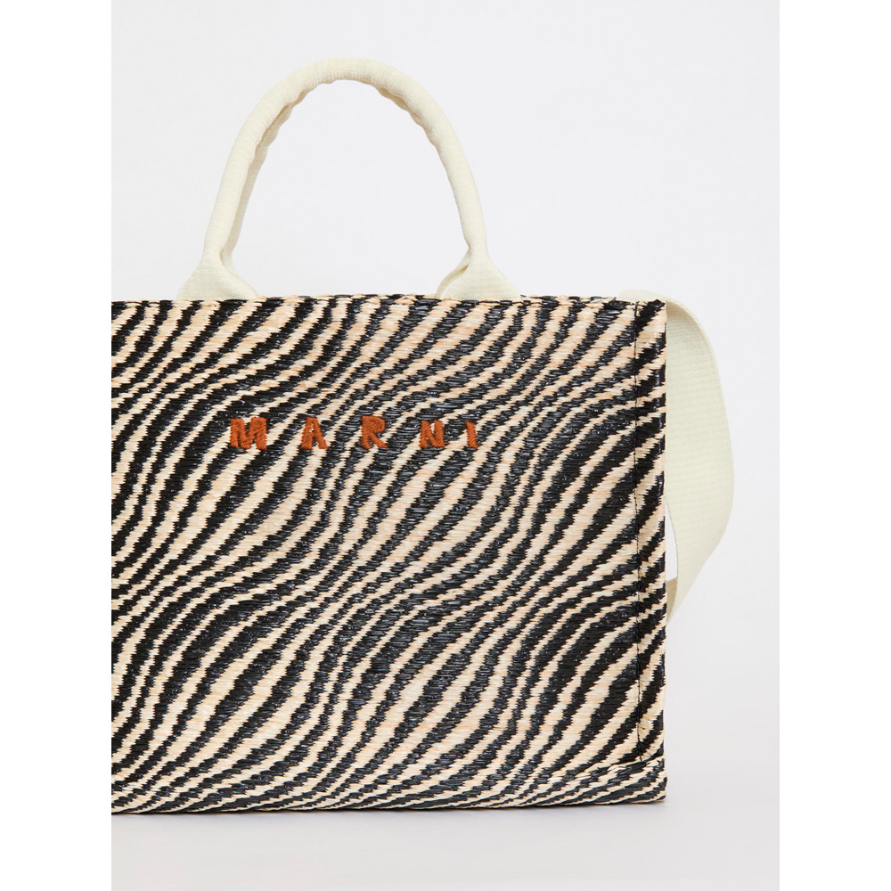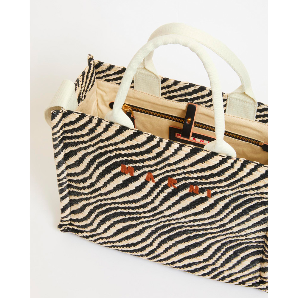 バイカラーのウェーブ柄が特徴的なバスケットスモールバッグ。内側にジップポケット、ショルダーストラップ付き。フロントにほどこされたロゴ刺しゅうがアクセントに。