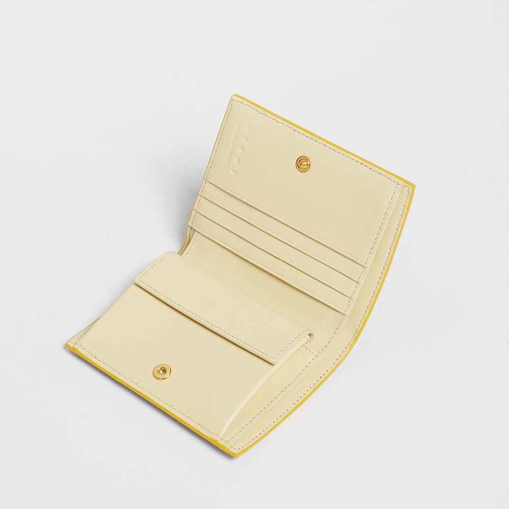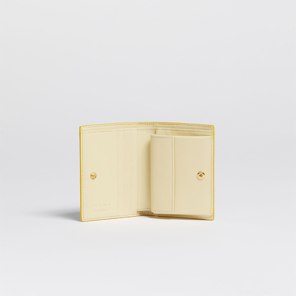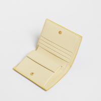 カーフレザー製の「MENDING」2つ折りウォレット。紙幣入れ1つ、カードスロット4つ、コインポケット1つ。ハンドステッチでほどこされたメンディングロゴのフラワーモチーフが愛らしいアクセントに。