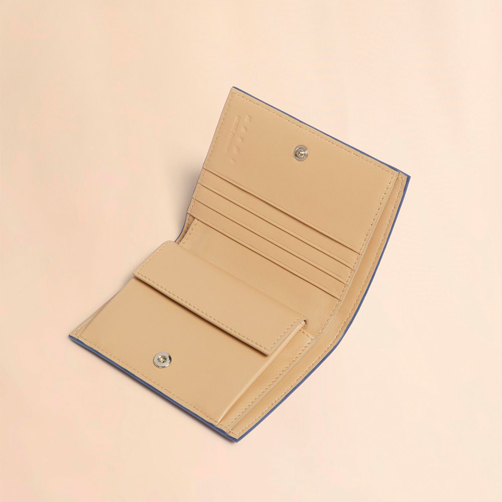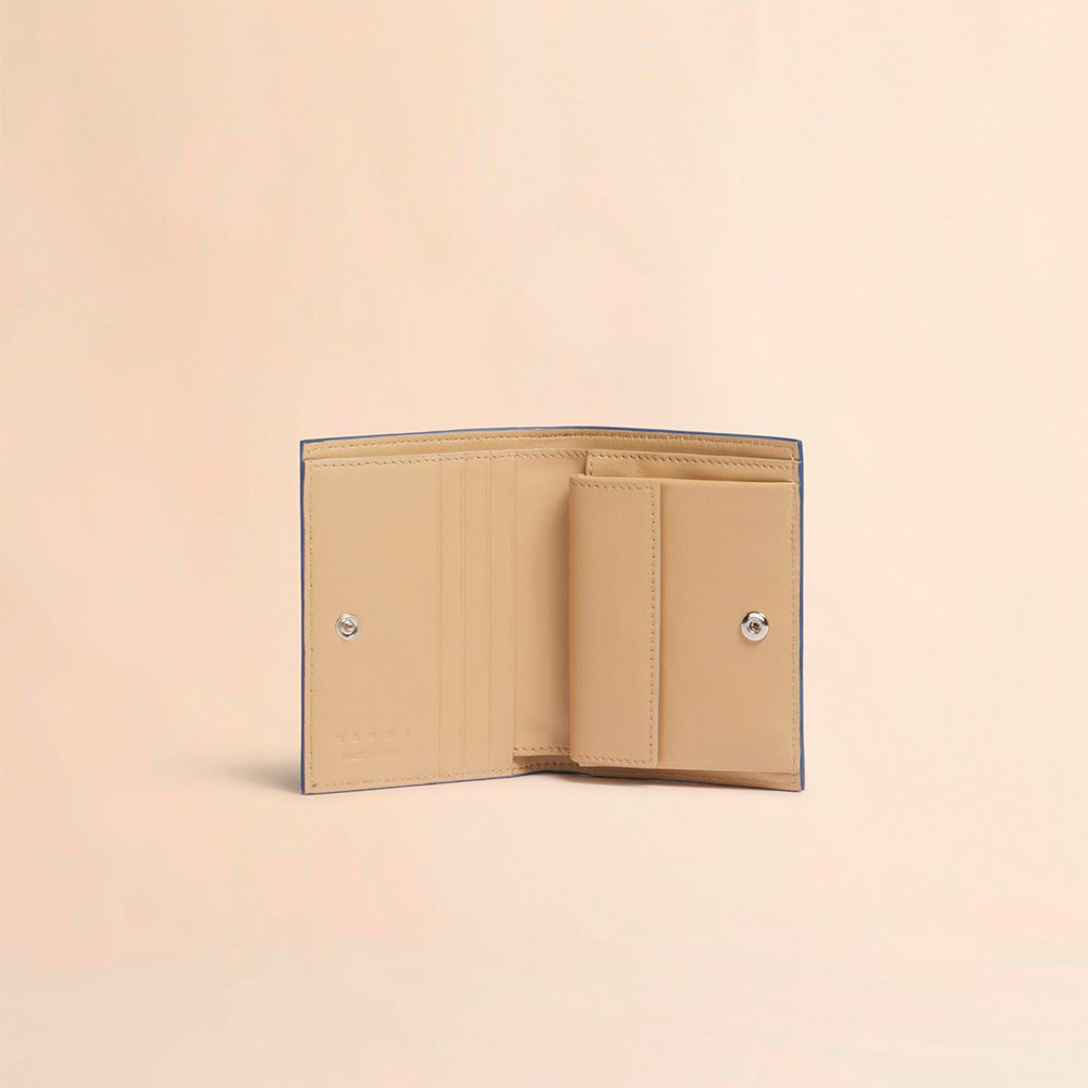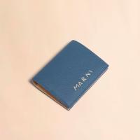 グレインレザー製の「MENDING」2つ折りウォレット。紙幣入れ1つ、カードスロット4つ、コインポケット1つ。ハンドステッチで施されたメンディングロゴがアクセントに。