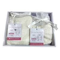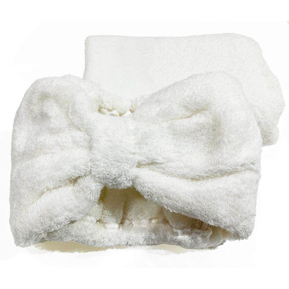 ヘアバンドとヘア専用タオルをセットにしました。繊維の先までふんわりと柔らかく、ちくちくしにくい心地よい肌触りの綿素材を使用しています。