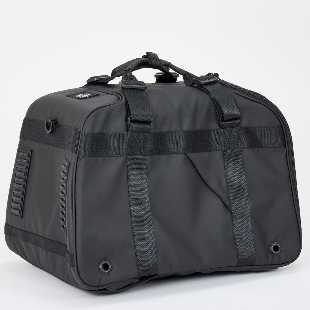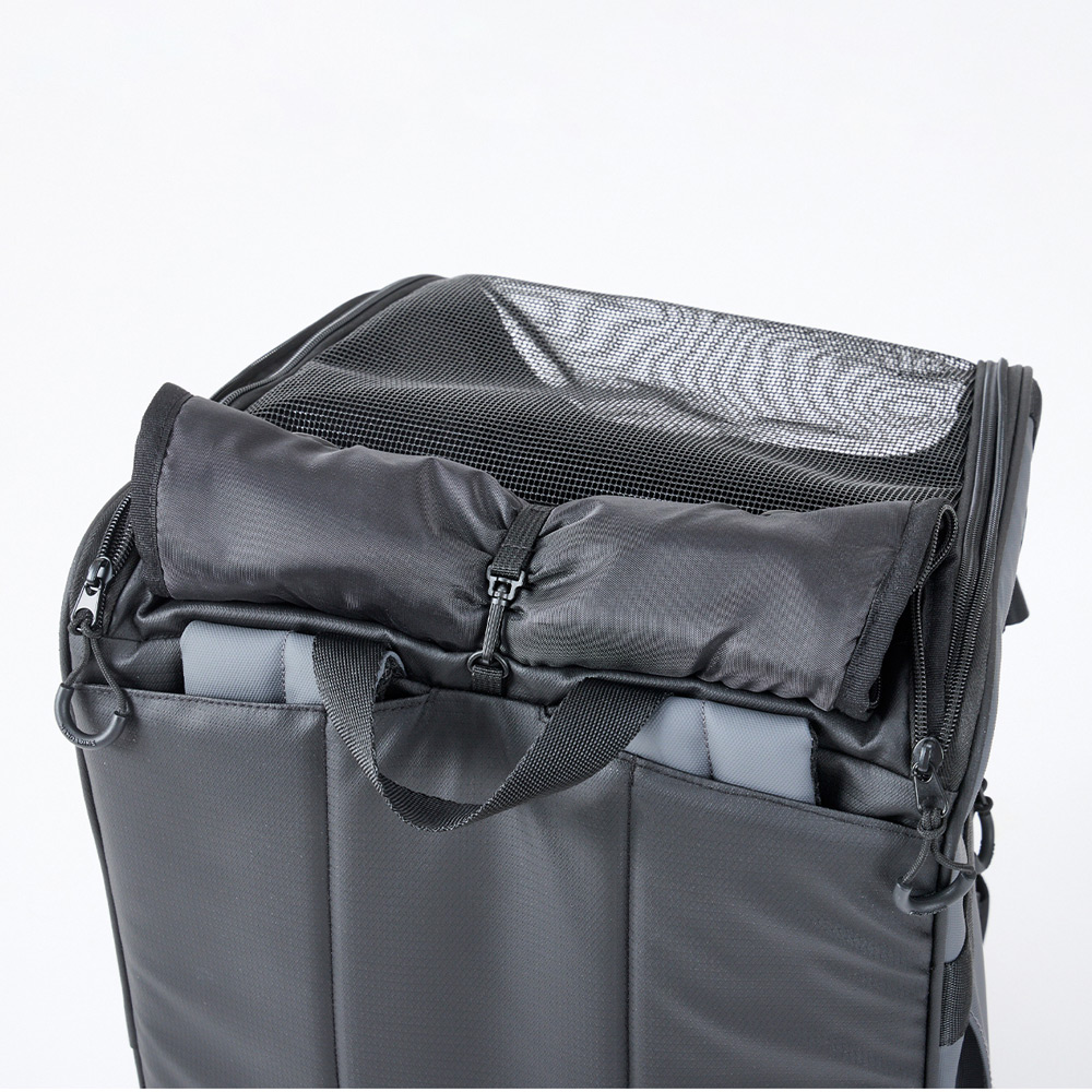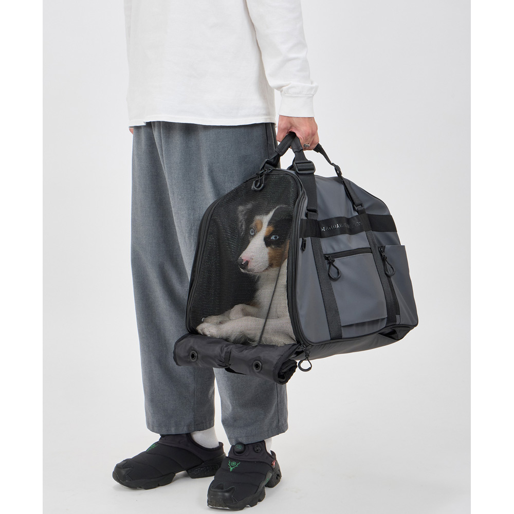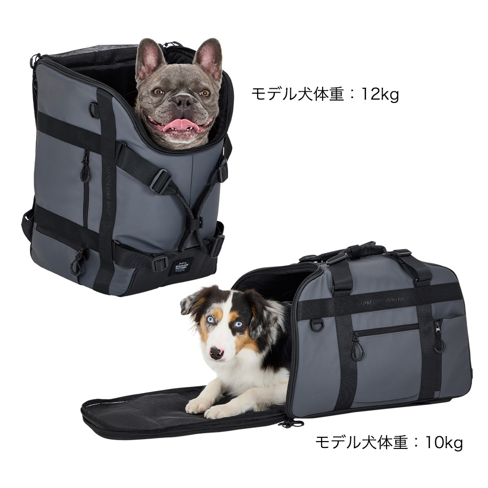便利な機能性も充実したスマートでスタイリッシュなマルチキャリーバッグ。横型、ショルダー掛け、ボストン持ち、縦型で前抱きスタイルバックパックとして使用可能。汚れの付きにくいコーティング生地でお手入れしやすい。大きなメッシュ窓で通気性に優れています。型崩れしにくいしっかり設計。裏地は抗菌防臭生地使用。飛び出し防止リード付き。汚れ防止の背面カバー(防水生地)が付属。バックパック用の肩ベルトは背面に収納可能。