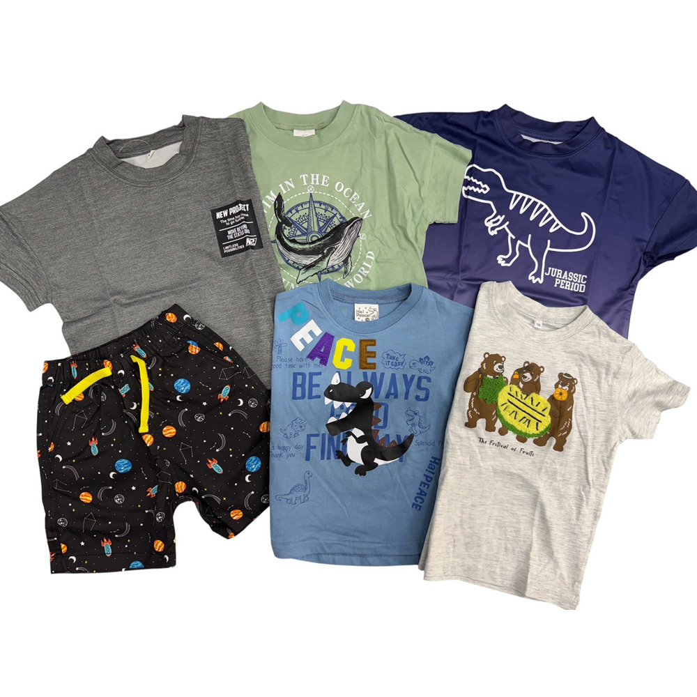 Tシャツ:グレー、Tシャツ:グリーン(クジラ)、Tシャツ:ネイビー(ダイナソー)、Tシャツ:杢グレー(くま)、Tシャツ:ブルー(ダイナソー)、4分丈パンツ:ブラック(宇宙)