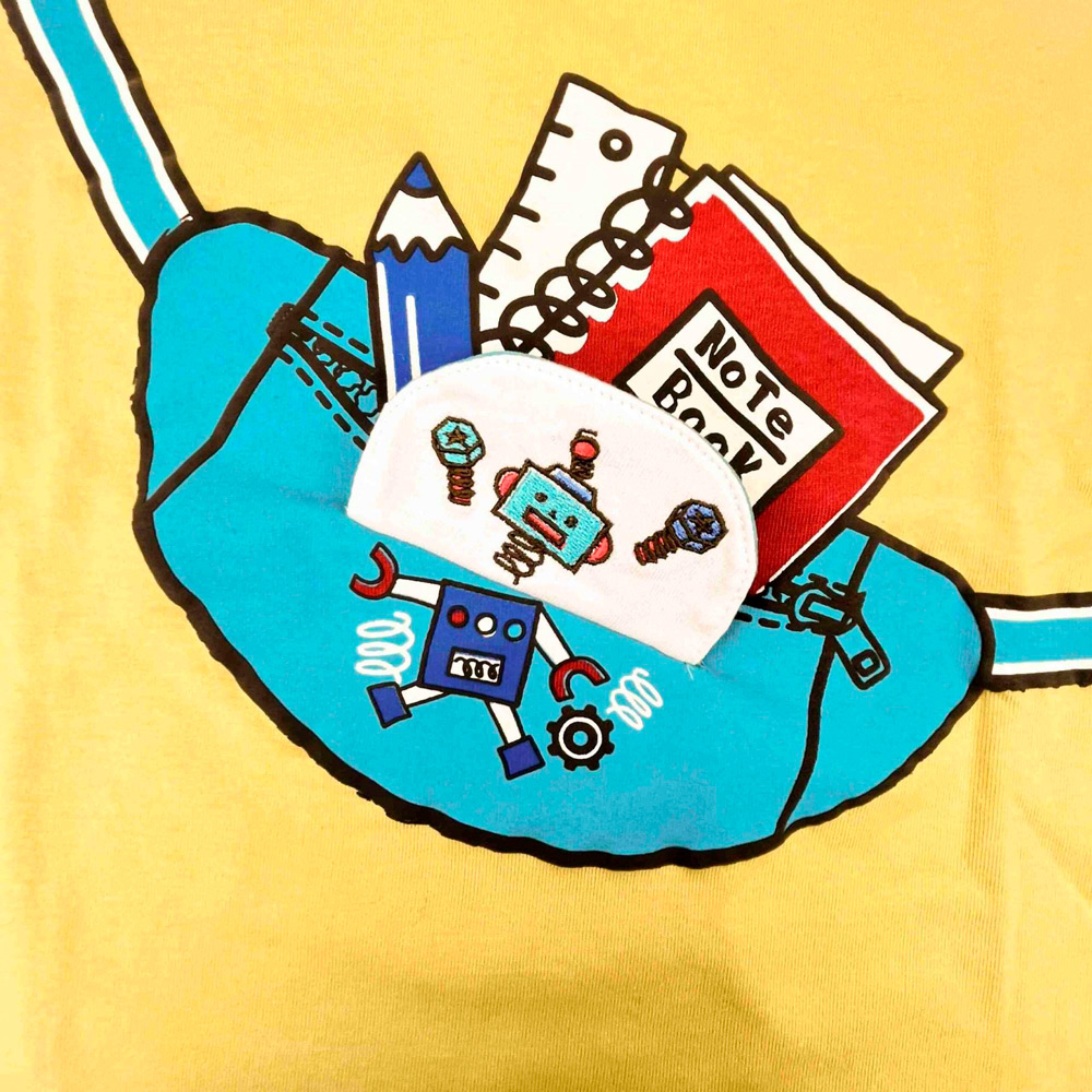ウエストバッグのフラップを開くと仕掛けが現れる、遊べるデザインが特徴の知育Tシャツ、通気性の良い綿混メッシュ素材を使用し、ZIPポケットやワッペン刺しゅうがアクセントになるTシャツ、軽く涼しいメッシュ素材のワイドTシャツは動きやすさも抜群です。さらに、ZIPポケットがポイントのハーフパンツはセットアップも可能で、夏の外遊びにもぴったりな4点セットです。