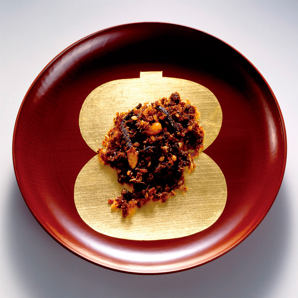 佃煮ふりかけの老舗、錦松梅。鰹節をはじめ、白胡麻、きくらげ、松の実などの山海の素材を使用したしっとりとしたふりかけです。伝統ある有田焼の器が食卓を彩ります。