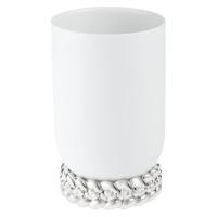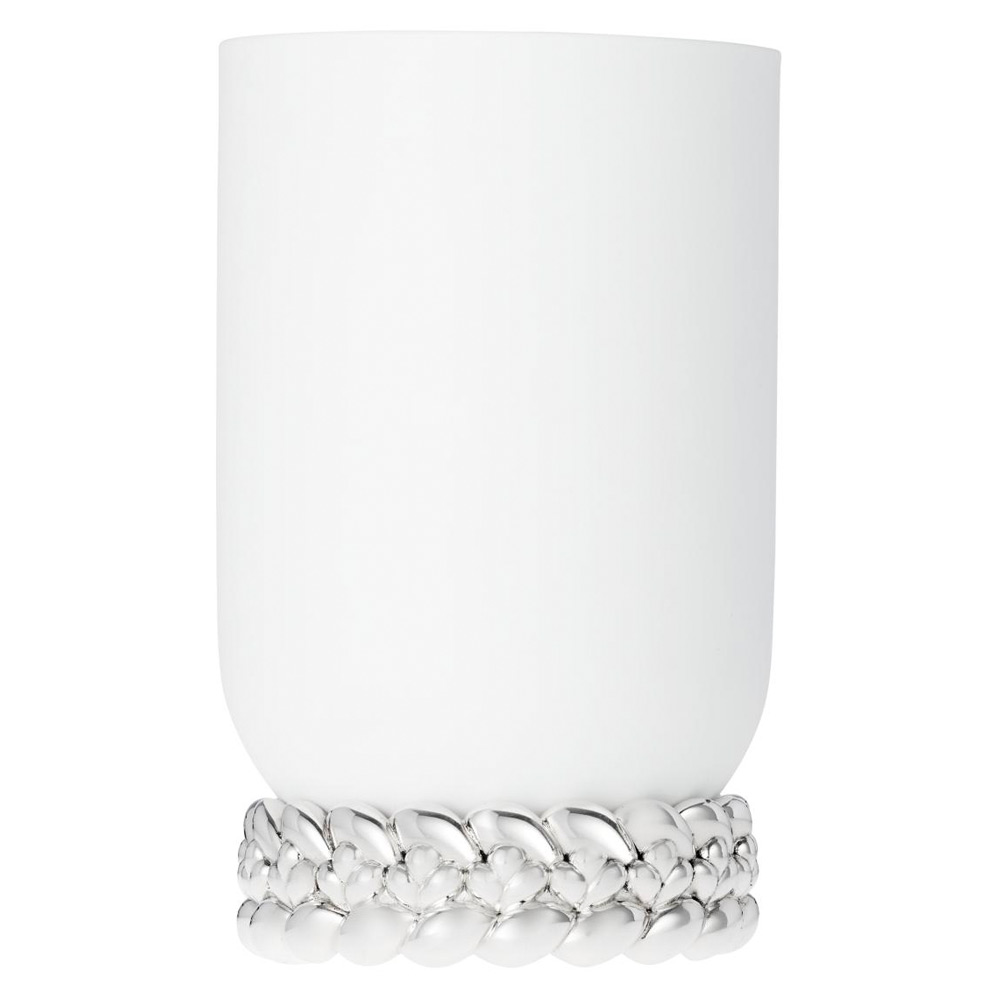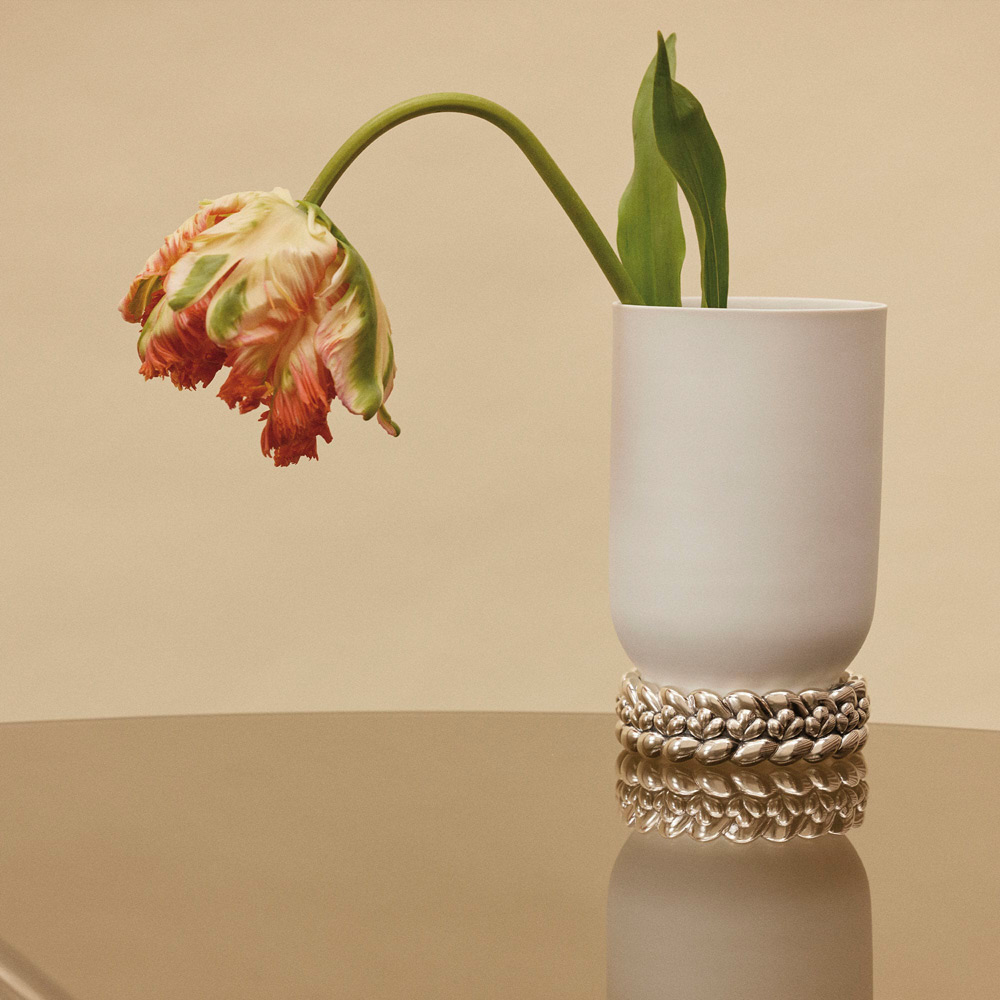 内側が釉薬でコーティングされ、外側がマット仕上げとなっています。美しく透き通る白いボディと、シルバーコーティングが施された編み込みデザインのベース部分は取り外しが可能。異素材の佇まいを楽しめます。