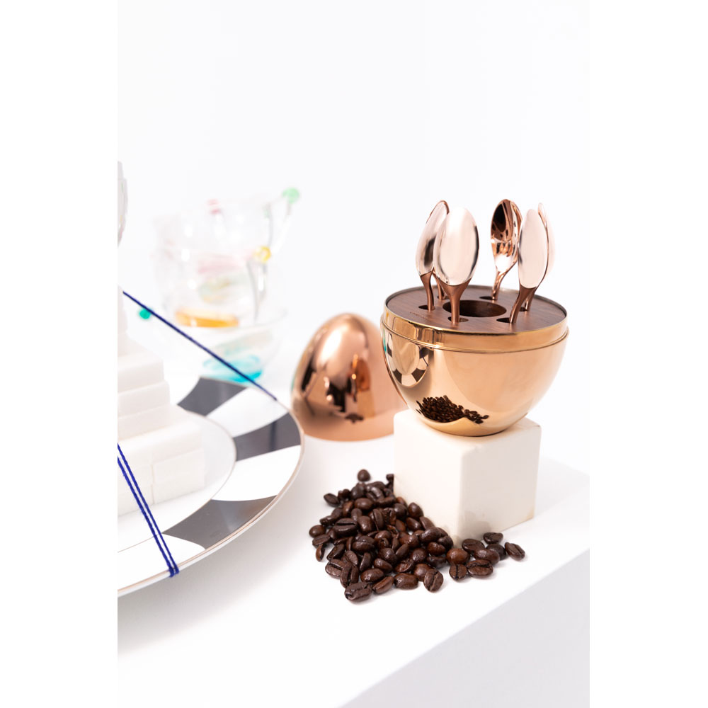 手のひらサイズのムード コーヒーには、コーヒータイムに重宝するデミタススプーン6本を収納。中心にはシュガースティックを納めることが出来ます。