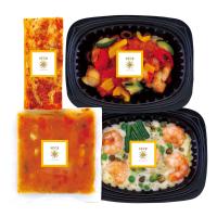 鶏肉のカチャトーラ170g、白身魚の白ワインソース180g、ボローニャ風ミートソースのラザニア120g、豆と大麦のオマールスープ150g