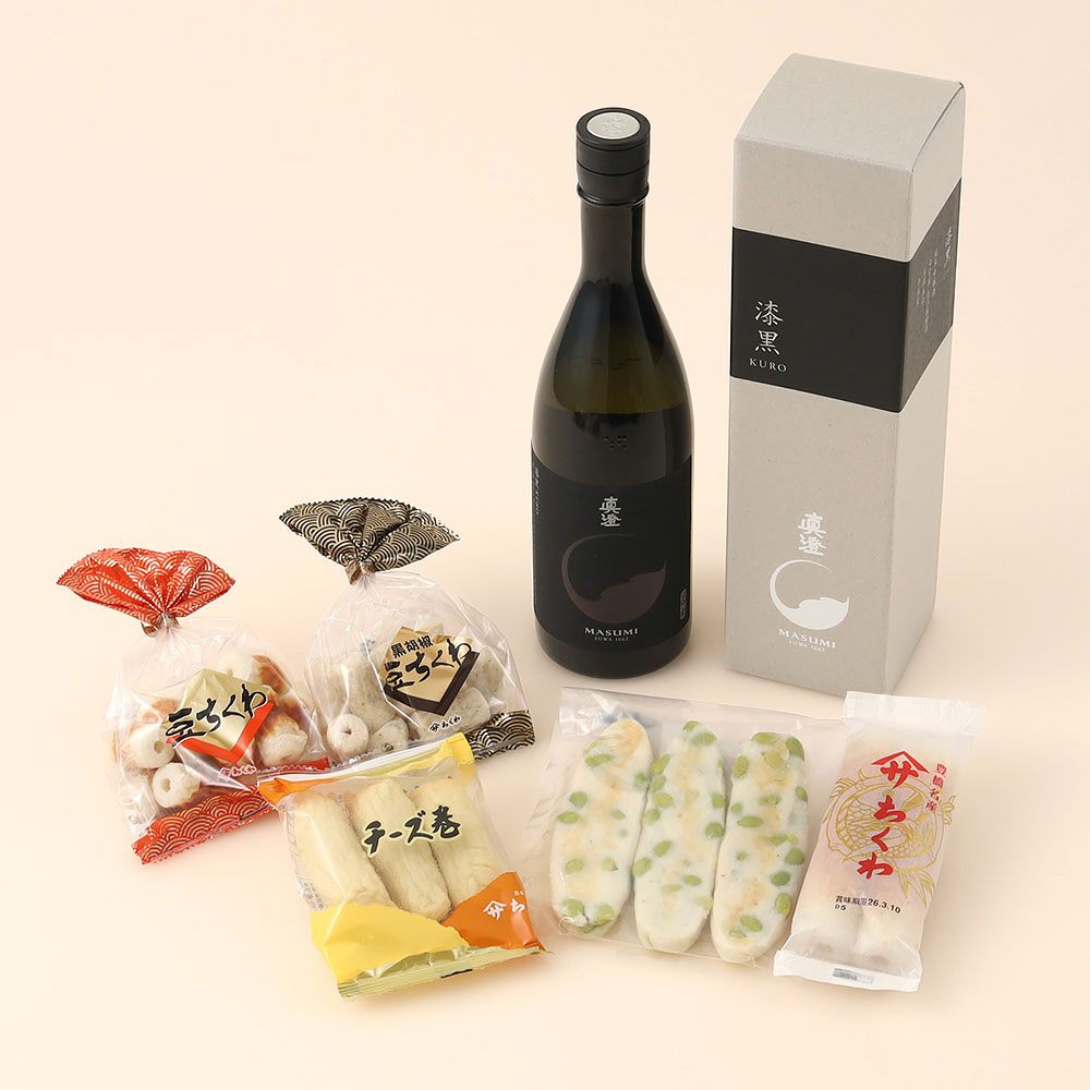 特製ちくわ2本、豆ちくわ10個、黒胡椒豆ちくわ10個、えだ豆くん3枚、チーズ巻3本、純米吟醸「真澄」漆黒KURO720ml