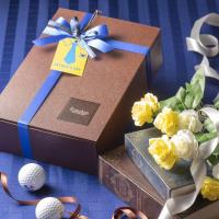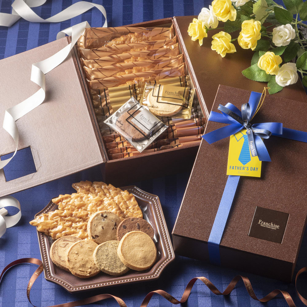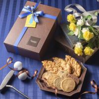 バラエティー豊かなお菓子を高級感のあるボックスに詰め合わせ、青いリボンをあしらいました。