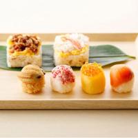 手まり寿し(サーモン、いくら錦糸、あなご、紅ずわい蟹×各2個)、笹蒸し寿し(国産牛しぐれ、紅ずわい蟹×各2個)