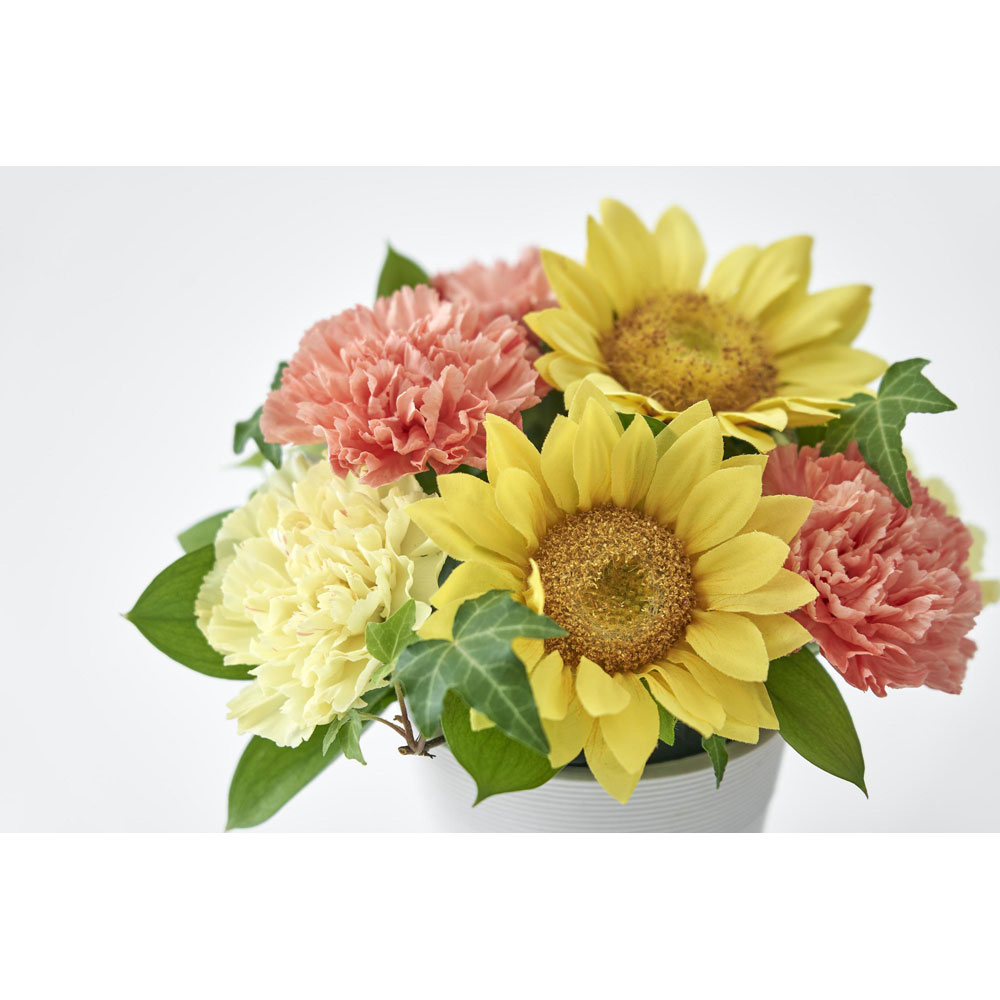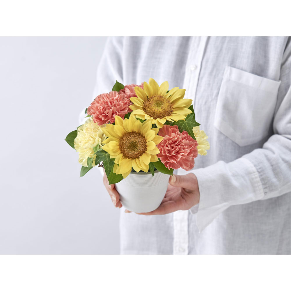 「敬慕」「憧れ」という、お父さまへの尊敬の想いに重なる花言葉を持つひまわり。その明るく力強い姿は、見ているだけで心に元気を運んでくれます。そんなひまわりを、<日比谷花壇>のデザイナー・西澤真実子さんが、特別な想いを込めてアレンジメントしました。洗練された仕上がりは、飾るだけでお部屋の雰囲気をパッと明るく塗り替え、爽やかな初夏の風を運んできてくれます。添えるのは、<とらや>の水羊羹。しっかりとした食感とコクのある味わいが特徴です。水羊羹で涼を楽しむのはいかがでしょうか。「お父さまの笑顔が、これからも太陽のように輝き続けますように」。日頃の「ありがとうございます」の気持ちを、ひまわりの瑞々しい輝きと、涼やかな味わいに乗せてお届けします。器に入ったアレンジメントスタイルですので、お父さまの手を煩わせることなく、届いてすぐに愉しんでいただけます。