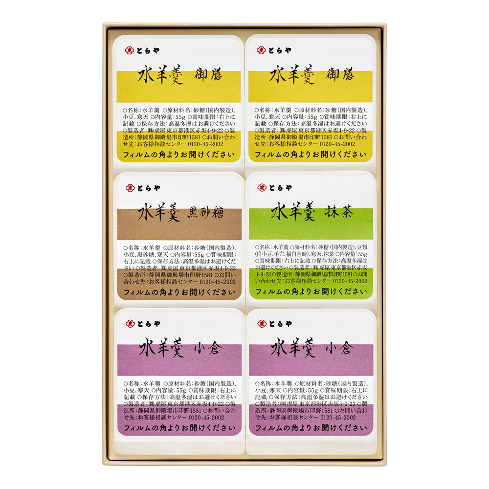 <とらや>水羊羹6個入(御膳(こし餡)・小倉 各55g×各2個、黒砂糖・抹茶 各55g×各1個)